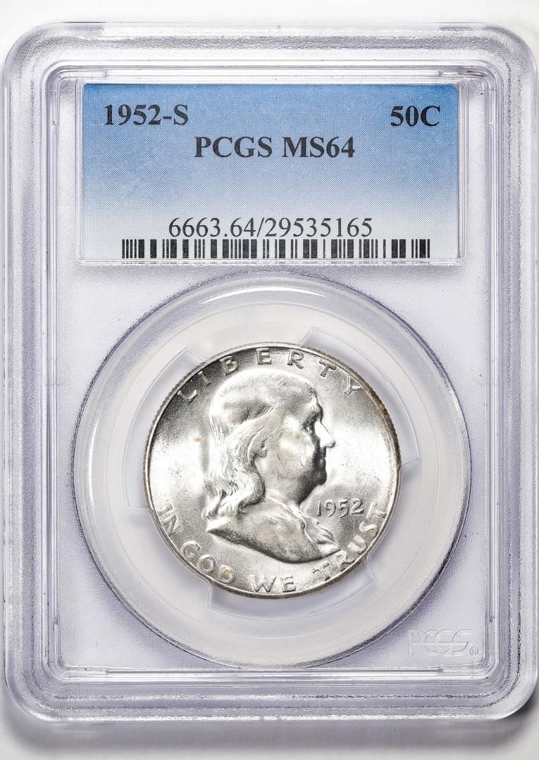 One 1952-S Franklin Half Dollar Coin PCGS MS64. PCGS Graded.