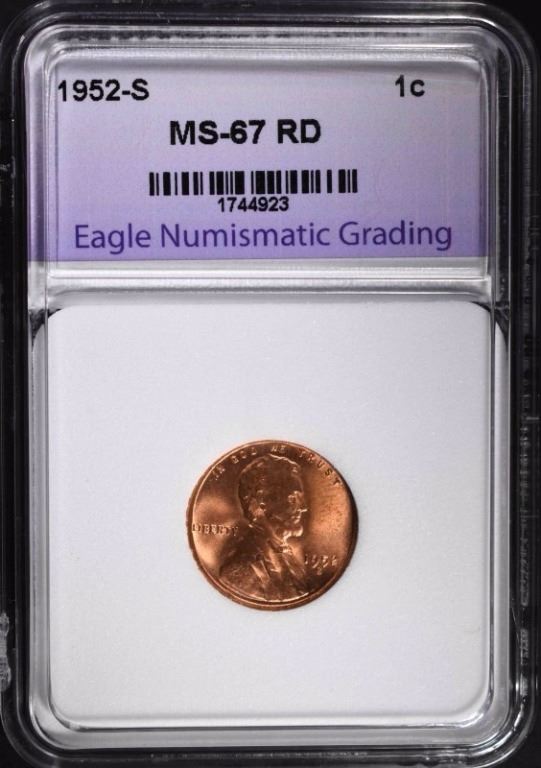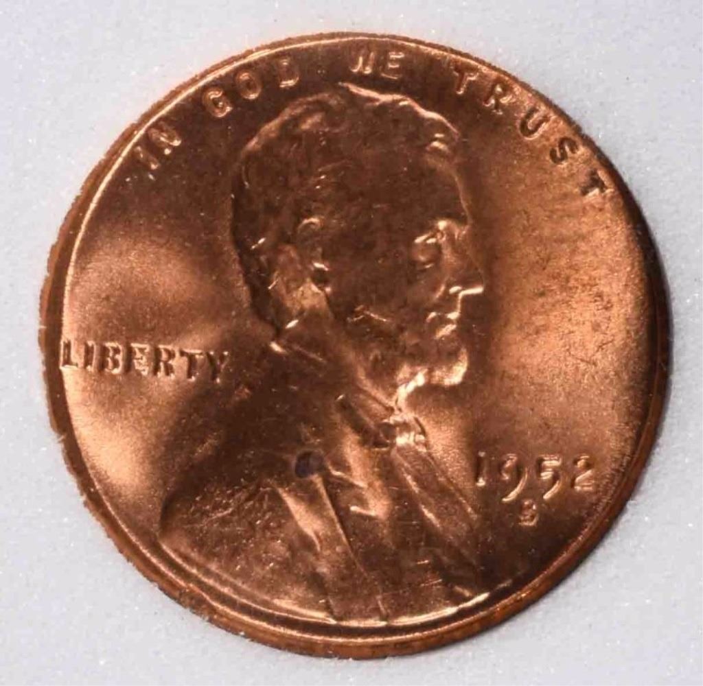 1952-S LINCOLN CENT, PCSS SUPERB GEM BU RED ESTIMATE $115 - $125.