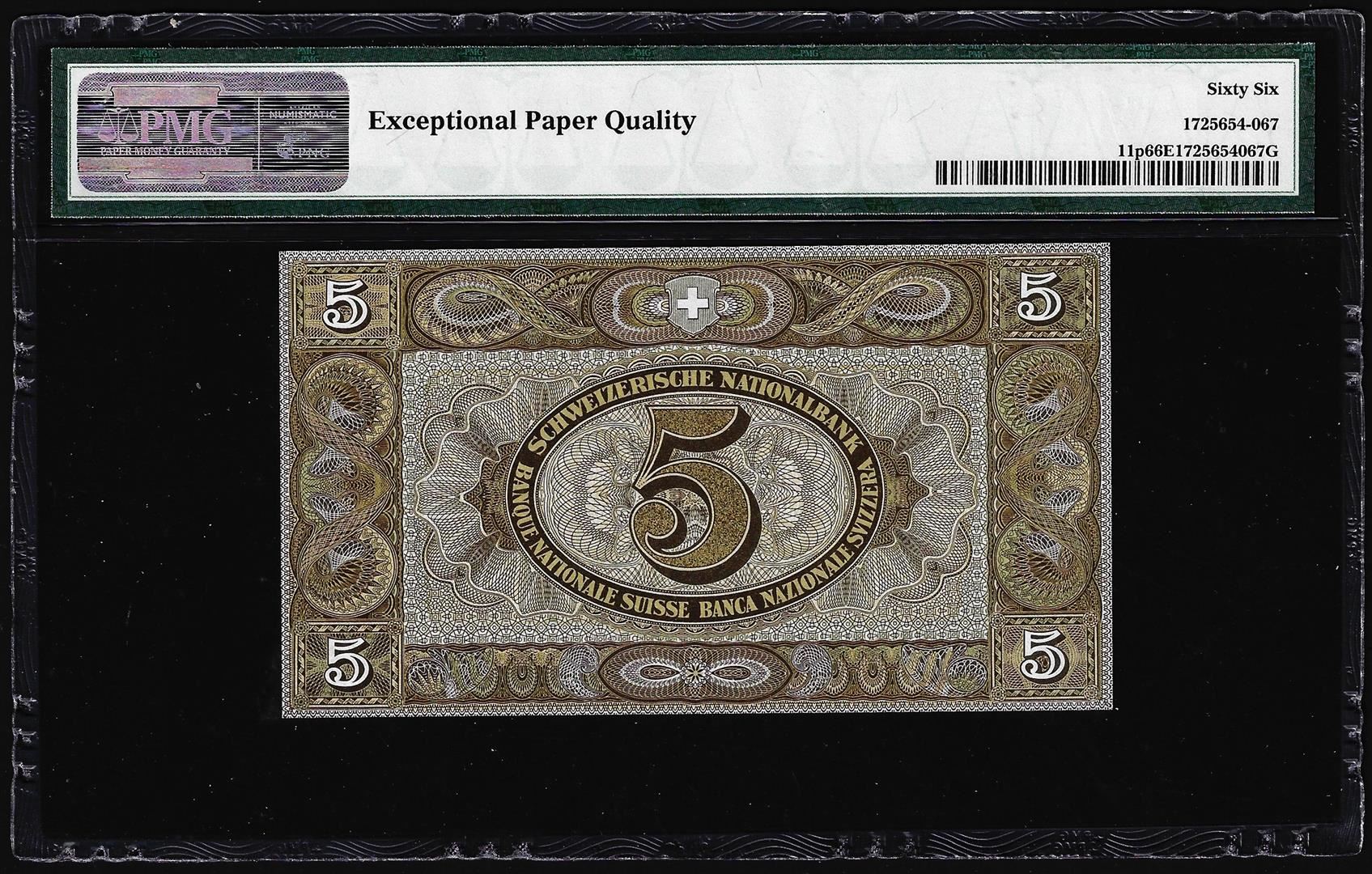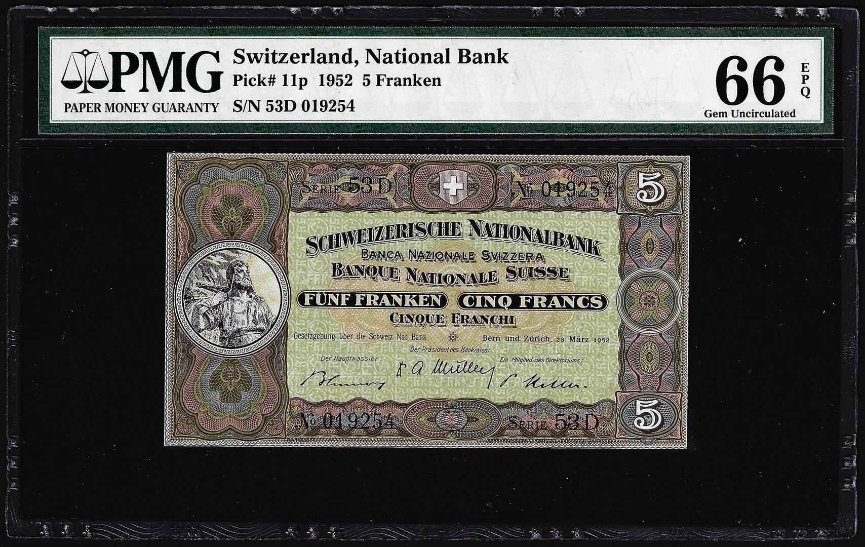 One 1952 Switzerland 5 Franken Note Pick# 11p PMG Gem Uncirculated 66EPQ. PMG Certified.