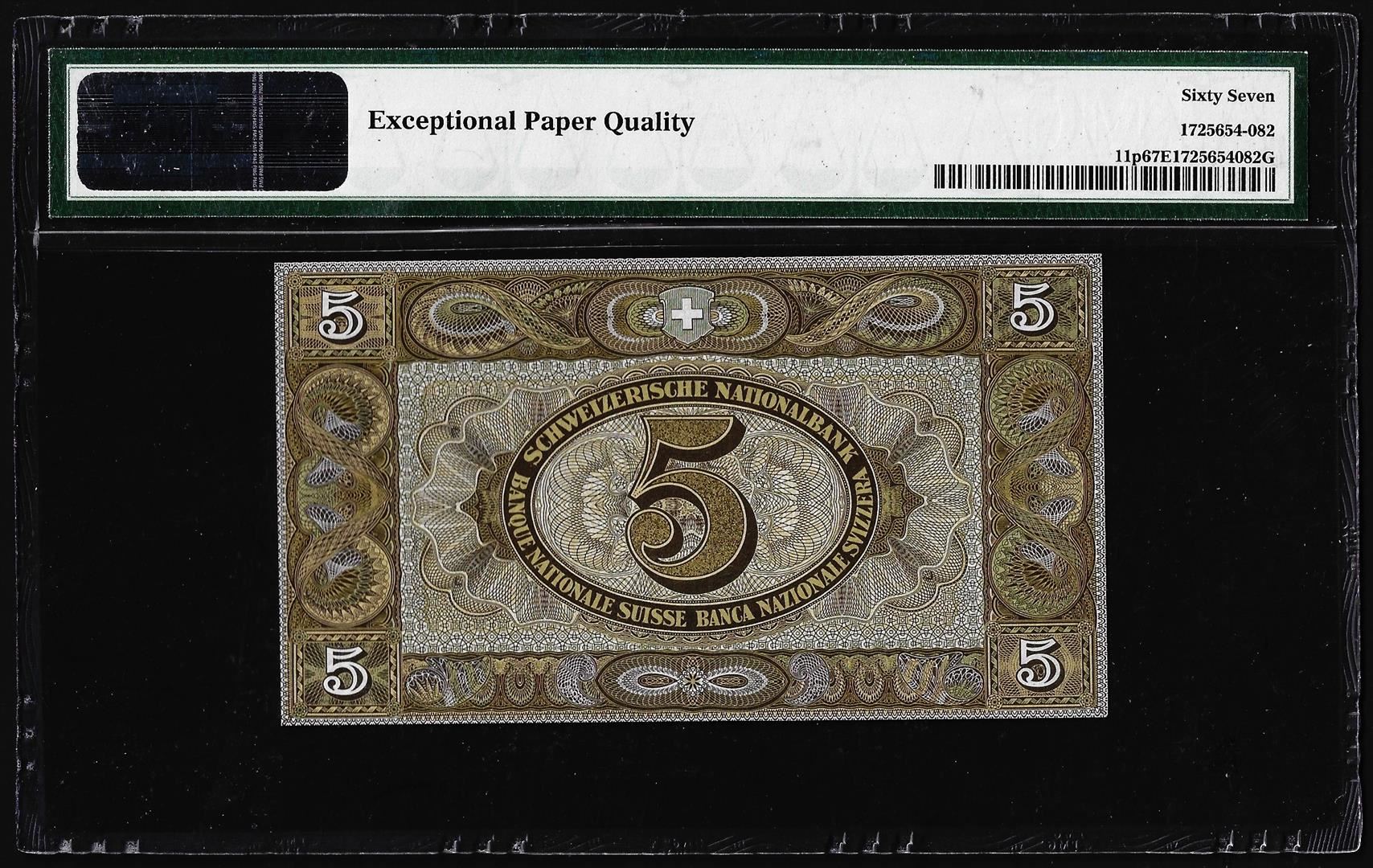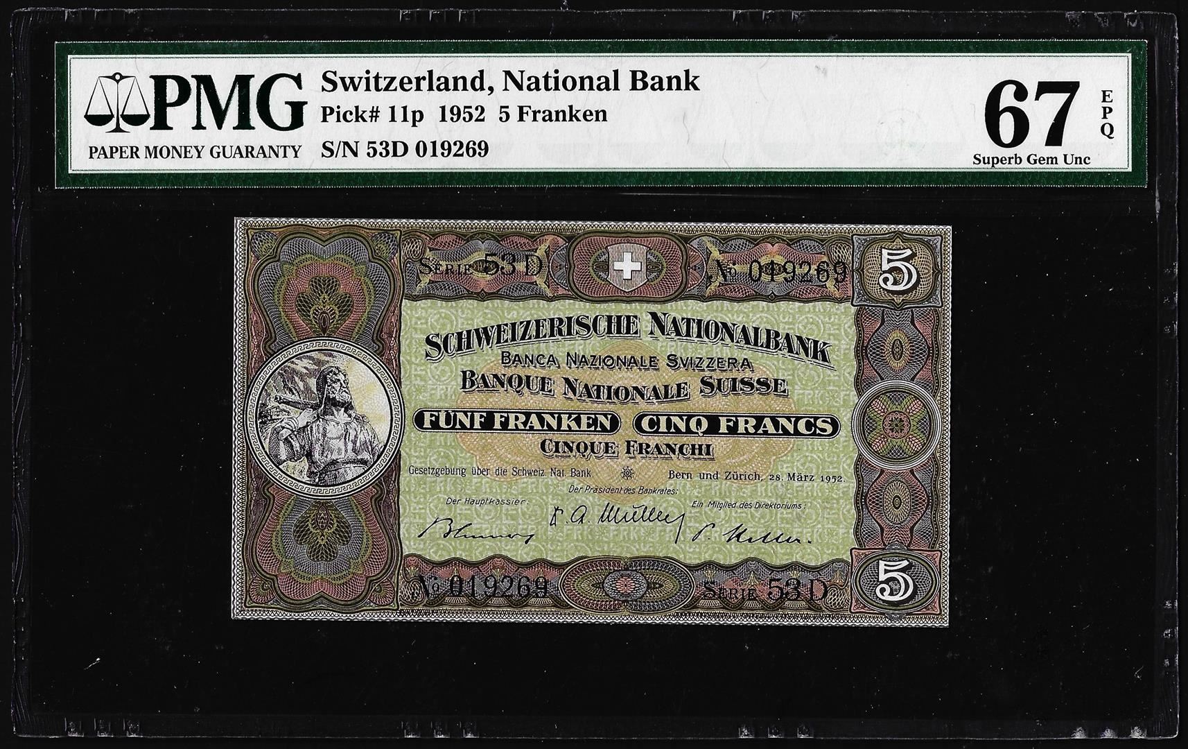 One 1952 Switzerland 5 Franken Note Pick# 11p PMG Superb Gem Uncirculated 67EPQ. PMG Certified.
