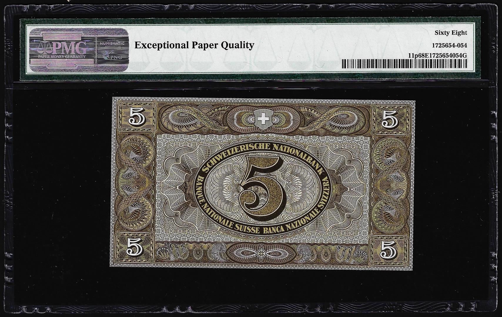 One 1952 Switzerland 5 Franken Note Pick# 11p PMG Superb Gem Uncirculated 68EPQ. PMG Certified.