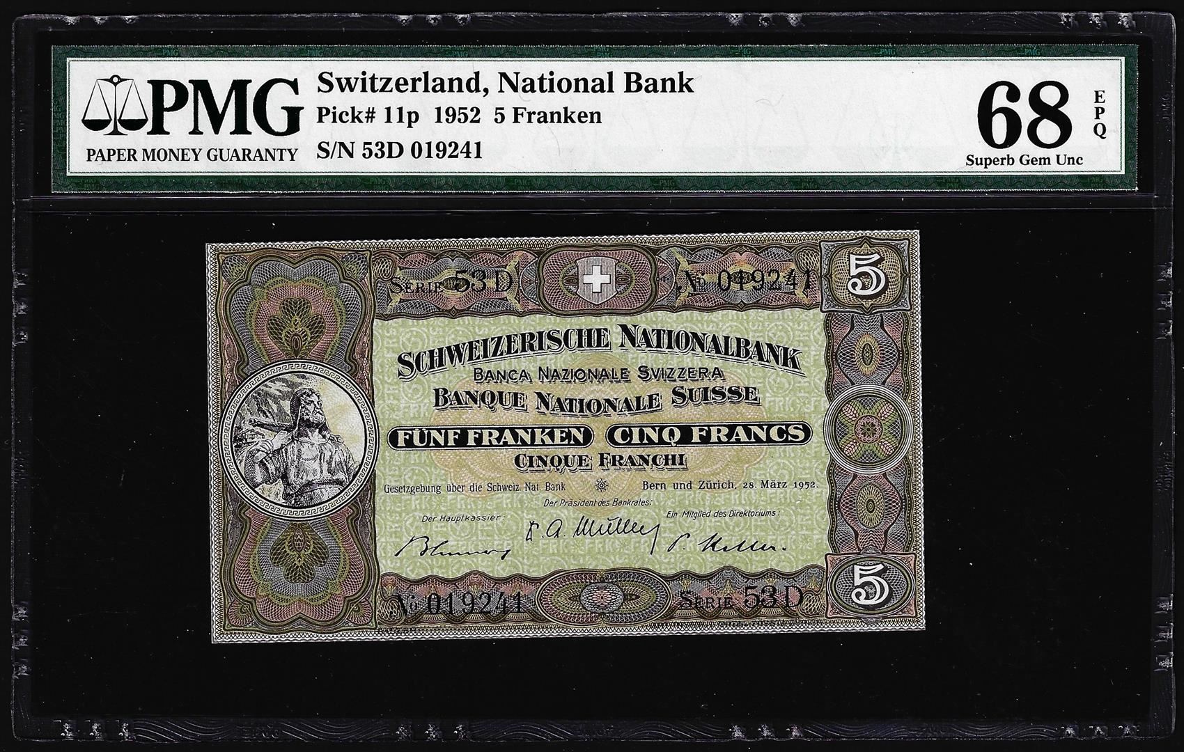 One 1952 Switzerland 5 Franken Note Pick# 11p PMG Superb Gem Uncirculated 68EPQ. PMG Certified.