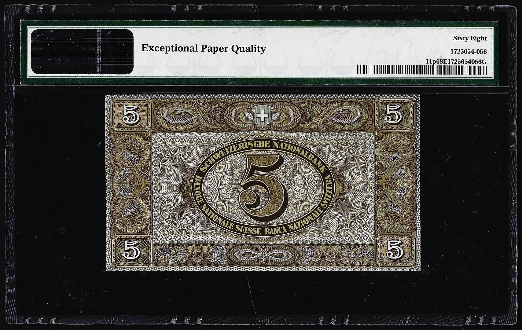 One 1952 Switzerland 5 Franken Note Pick# 11p PMG Superb Gem Uncirculated 68EPQ. PMG Certified.