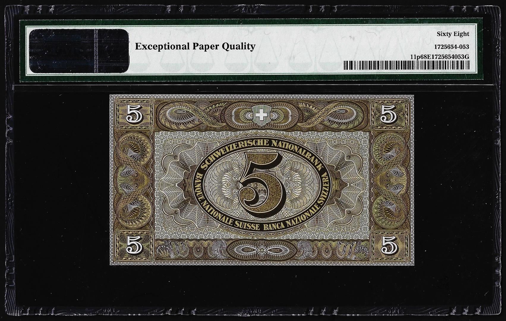 One 1952 Switzerland 5 Franken Note Pick# 11p PMG Superb Gem Uncirculated 68EPQ. PMG Certified.