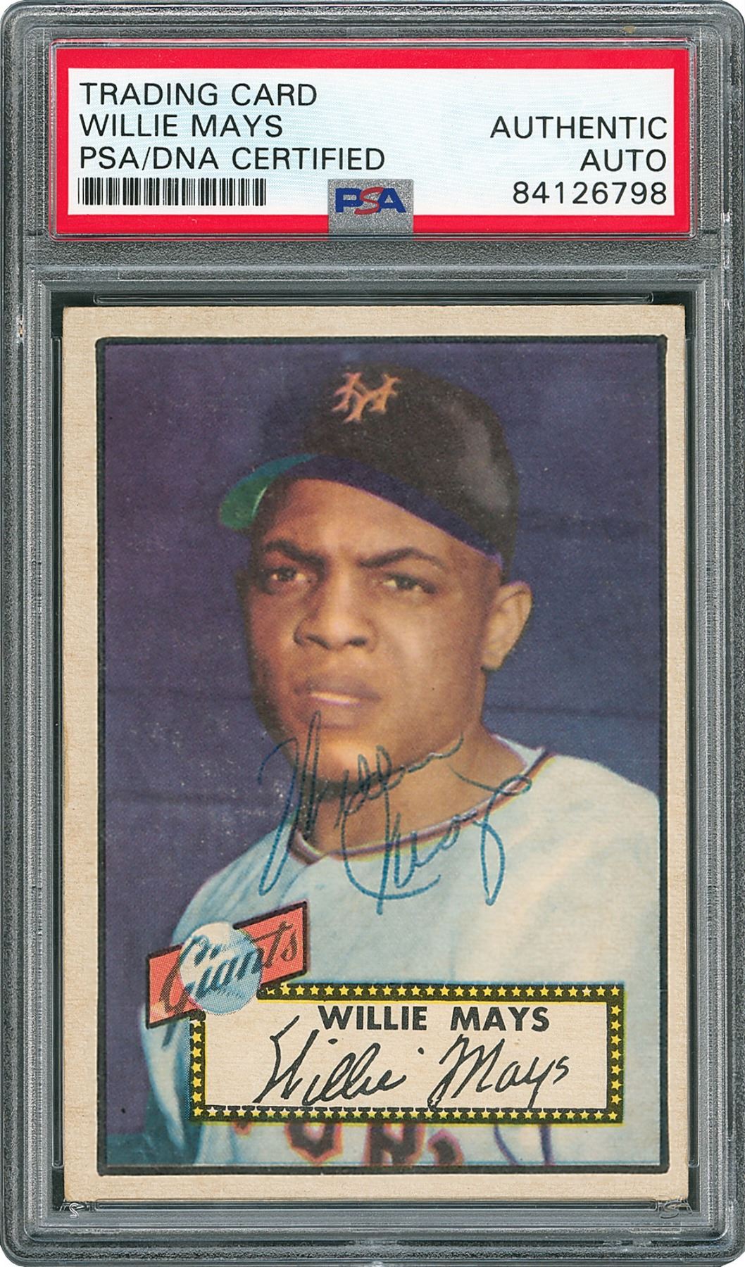 Authenticated and encapsulated by PSA/DNA. An absolutely beautiful vintage blue ink, rookie era "Willie Mays" signature graces this first Topps card for the 'Say Hey Kid.' Card itself appears EX overall. Stunning signature.