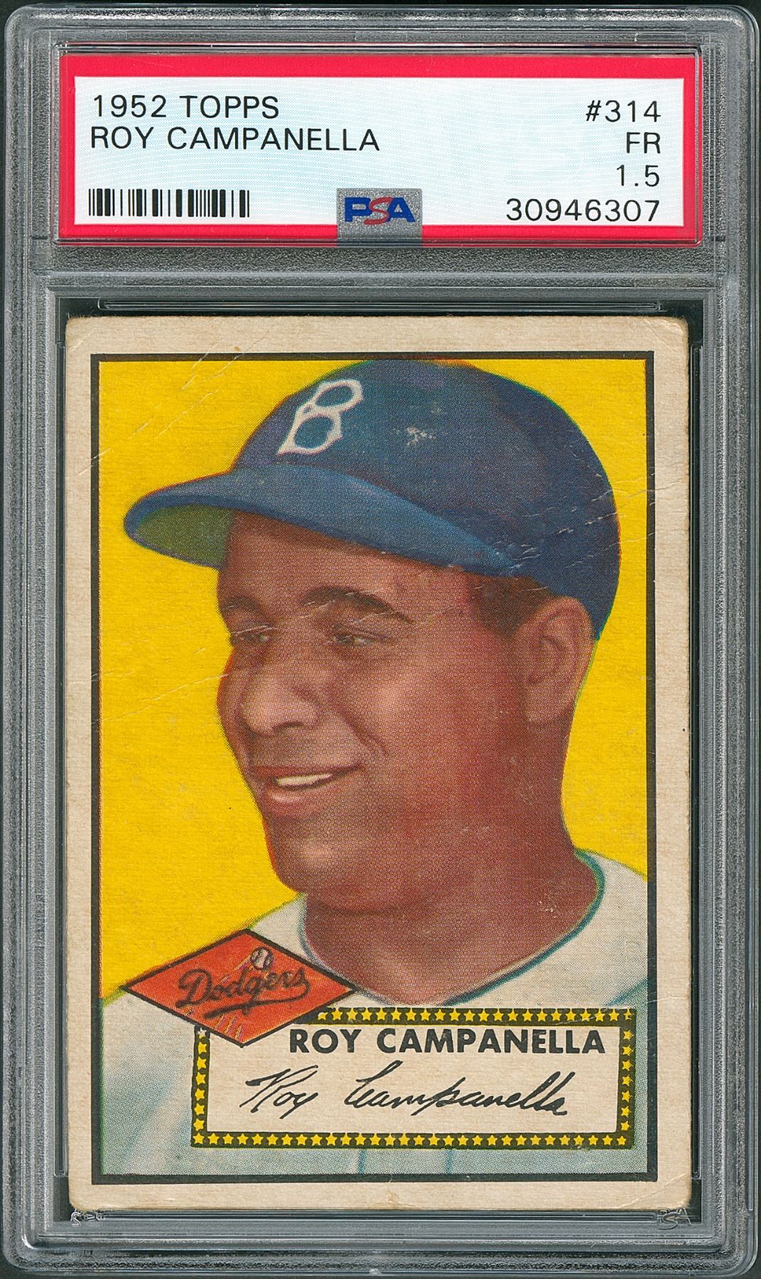 Graded by PSA FR 1.5. From the desirable high-numbered series, this is Campanella’s first Topps card, issued a year after his first of three MVP seasons. Unusually well centered, this example has several creases, but strong color and clean surfaces front and back. An affordable and well-centered example.