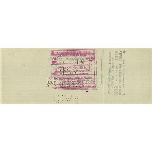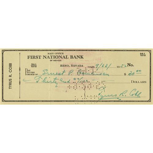 <B>1952 Ty Cobb Signed Check.</B></I> On the forty-seventh anniversary of his first Major League home run as an eighteen-year old rookie, the great Tyrus Raymond Cobb filled out and signed this personal check in his unmistakable green ink hand. The thirty dollar check apparently paid for some sort of jewelry, as the stamped endorsement on the back suggests. All ink is 9/10 or better, and a single vertical fold line is invisible upon all but the closest inspection. Absolutely a top example of this essential collectible. <I>LOA from PSA/DNA.</B></I> <BR><BR><B>Important notice:</B> Heritage usually auctions material at the rate of 200-250 lots per hour. On some occasions eBay Live bid software or the Internet may not be able to keep up with the pace of the auction. We recommend placing a realistic absentee bid now as insurance to avoid disappointment. Occasionally the auctioneer may eliminate or reject an eBay Live bid, and the auctioneer may also reopen a lot after the close of the eBay live bidding (usually because we missed an audience bid), and may reject your bid even if it shows you as the winning bidder. By bidding via eBay Live, you agree that Heritage may award the lot to another bidder at its sole discretion under the circumstances described above or any other reasonable circumstances. Since eBay bids are not shown to us until we open the lot on the floor, we treat those bids just like floor bids. In most cases the floor responds before the eBay bid is presented to us, due to Internet lag time, so for consistency we have made it a policy that floor bids are always considered first over tie eBay live bids. Also please note that all Heritage lots purchased through eBay Live carry a 22.5% Buyer's Premium. Please make sure you read the Terms and Conditions before you bid. This lot is being auctioned in conjunction with a live floor auction by Heritage Galleries & Auctioneers. All final auction and invoice information will be supplied by Heritage Galleries & Auctioneers, and all other information should be considered preliminary. Lot:19091 <BR><BR><B>Winning Notification and Billing:</B> After the FINAL session in this auction is complete, Heritage will send e-mail and snail mail invoices. This process normally takes several days. All final auction and invoice information will be supplied by Heritage Galleries & Auctioneers, and all other information should be considered preliminary. <BR><BR>This auction will be conducted on a live auction floor and over the Internet through eBay Live. If you choose to place an absentee bid, please take a moment to <font color='#0000ff'><u><a href='http://pages.ebay.com/liveauctions/help/before/laabsentee.html'>learn how eBay Live absentee bidding works</a></u></font><font color='#000000'>
