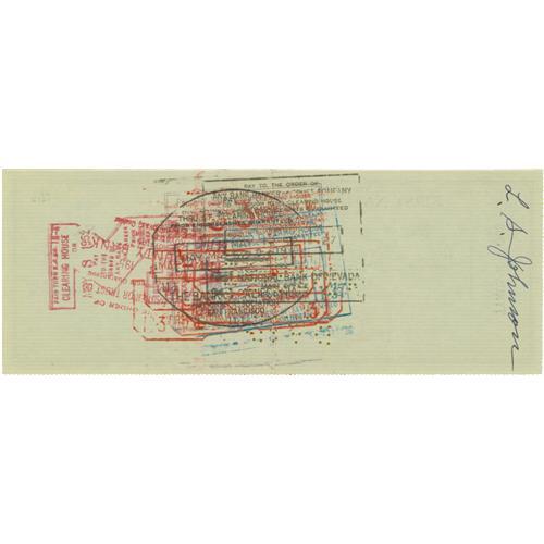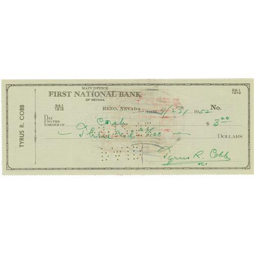 <B>1952 Ty Cobb Signed Check.</B></I> The Dead Ball legend's preferred green ink is a bold 10/10 on this personal check filled out and signed entirely in Cobb's hand. The three dollar cash payment is accepted with a signature on verso from another party. Very light vertical creases from the check having been folded into quarters are evident, though they are only visible upon very close inspection. As the market for quality signed personal check continues along its steady upward arc, smart investors are snapping up examples such as this. We recommend that you follow their lead. <I>LOA from PSA/DNA.</B></I>