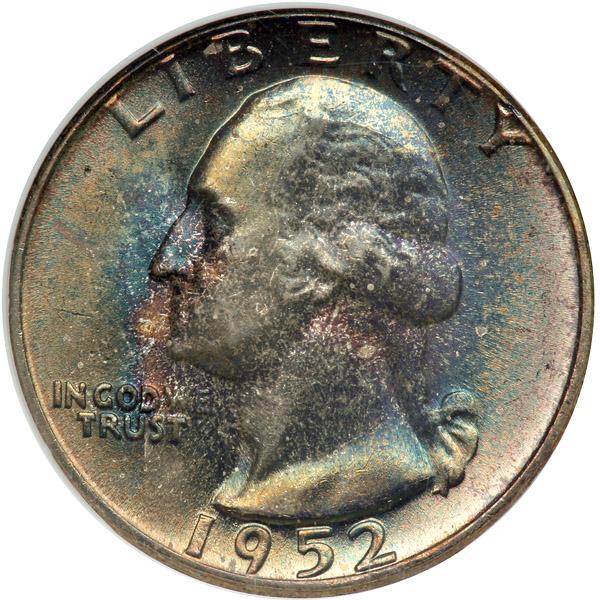 1952 Washington Quarter Dollar. NGC graded MS-68. Lovely blue and lilac toning on both sides. In an old NGC holder. Exquisite color and surfaces, exquisite potential for a Registry Set of Toned Specimens. Pop 4; none finer.