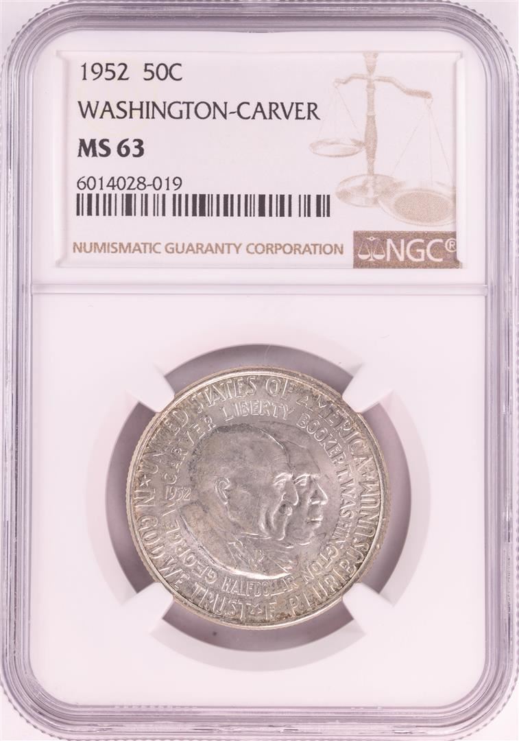 One 1952 Washington-Carver Commemorative Half Dollar Coin NGC MS63. NGC Certified.