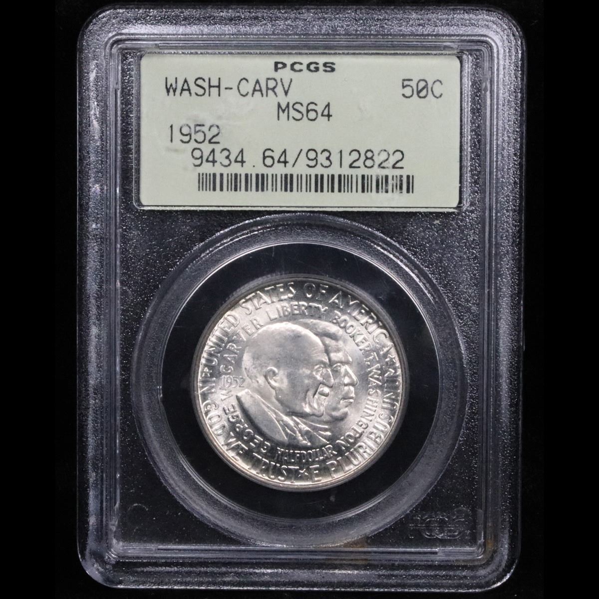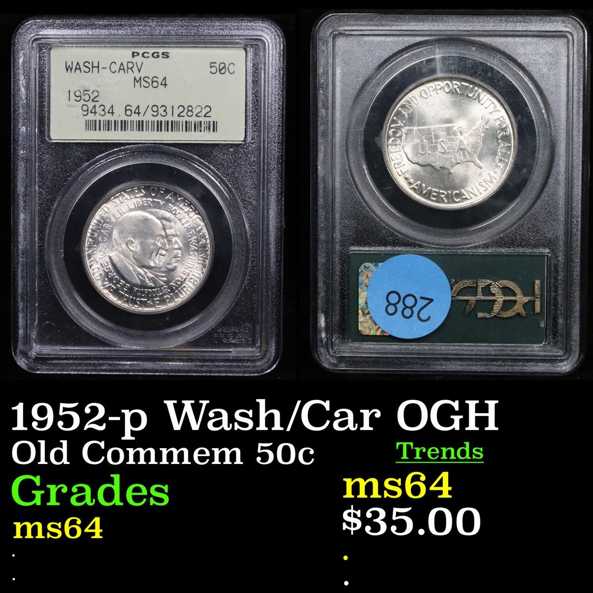 1952-p Wash/Car . . Old Commem Half Dollar 50c Graded ms64 By PCGS. The Final Coin in the Old Commemorative Program. It was Minted to Revive the Ending Booker T Washington Commemorative and to Honor Washington Carver. When examining a Wash/Carver examine the High Points, which are Carver's cheek on the Obverse and the Center of the USA on the Reverse. 0