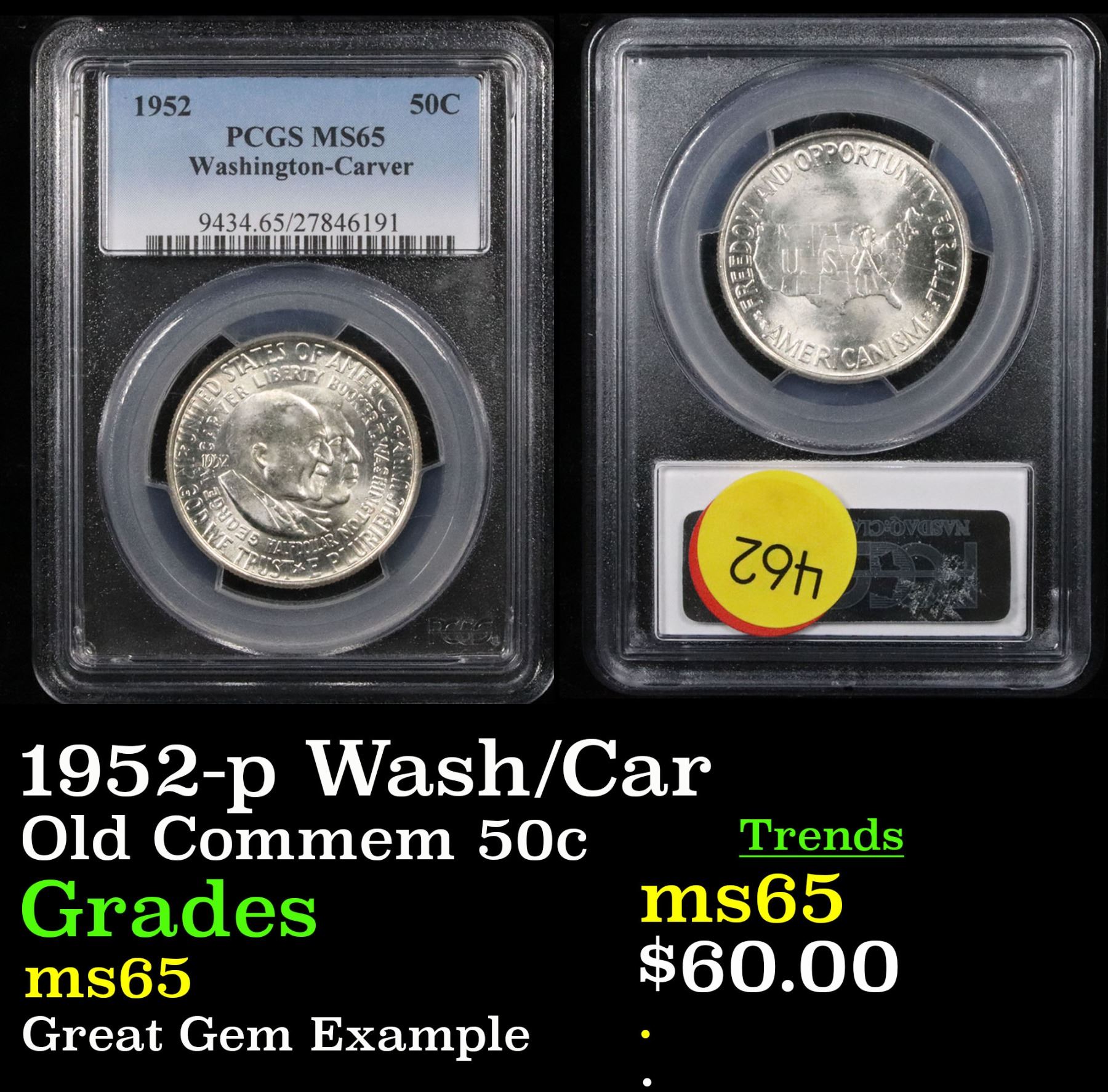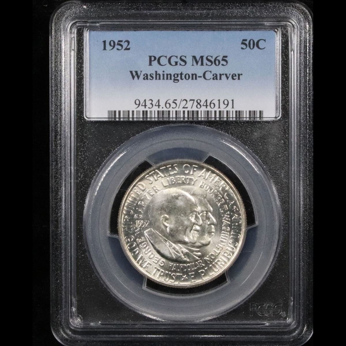 1952-p Wash/Car . Great Gem Example Old Commem Half Dollar 50c Graded ms65 By PCGS. The Final Coin in the Old Commemorative Program. It was Minted to Revive the Ending Booker T Washington Commemorative and to Honor Washington Carver. When examining a Wash/Carver examine the High Points, which are Carver's cheek on the Obverse and the Center of the USA on the Reverse. 0