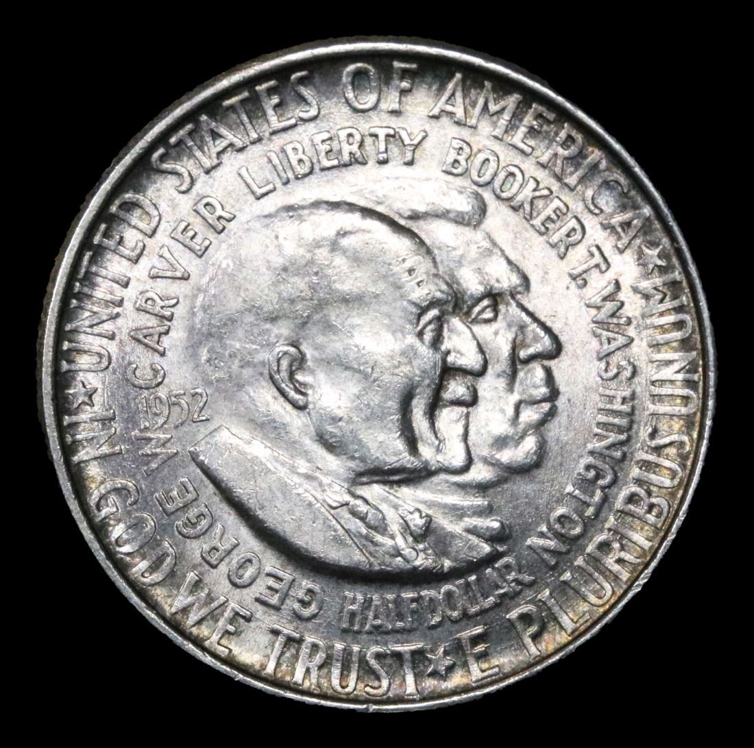1952-p Wash/Car Old Commem Half Dollar 50c Grades Choice AU/BU Slider. The Final Coin in the Old Commemorative Program. It was Minted to Revive the Ending Booker T Washington Commemorative and to Honor Washington Carver. When examining a Wash/Carver examine the High Points, which are Carver's cheek on the Obverse and the Center of the USA on the Reverse.