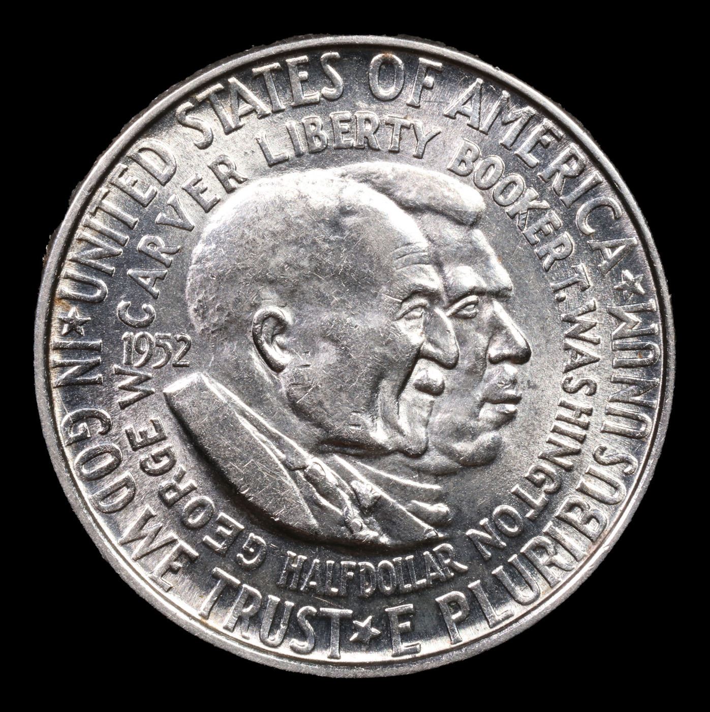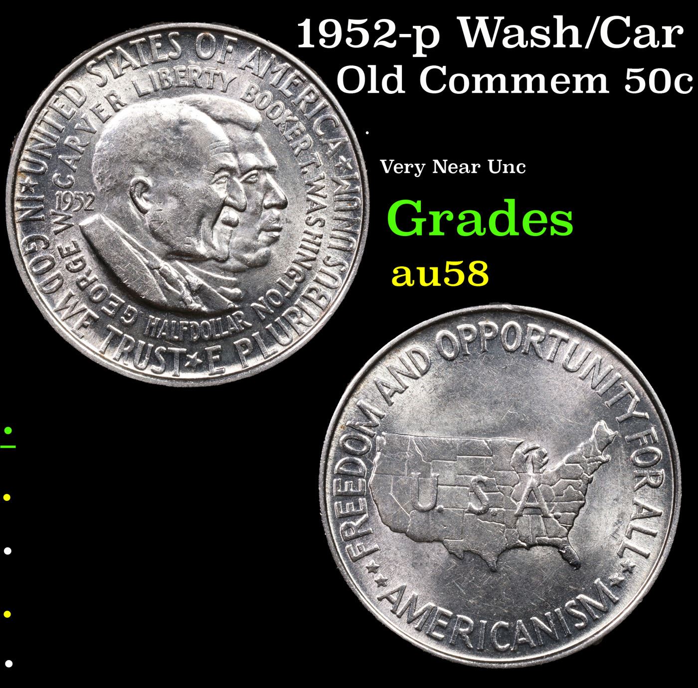 1952-p Wash/Car Old Commem Half Dollar 50c Grades Choice AU/BU Slider. The Final Coin in the Old Commemorative Program. It was Minted to Revive the Ending Booker T Washington Commemorative and to Honor Washington Carver. When examining a Wash/Carver examine the High Points, which are Carver's cheek on the Obverse and the Center of the USA on the Reverse.