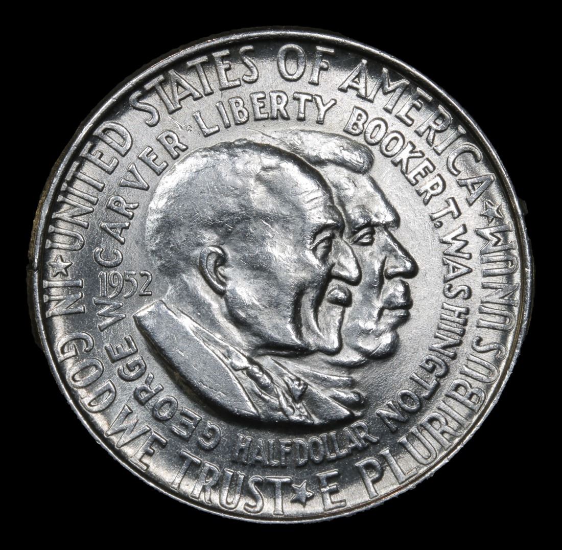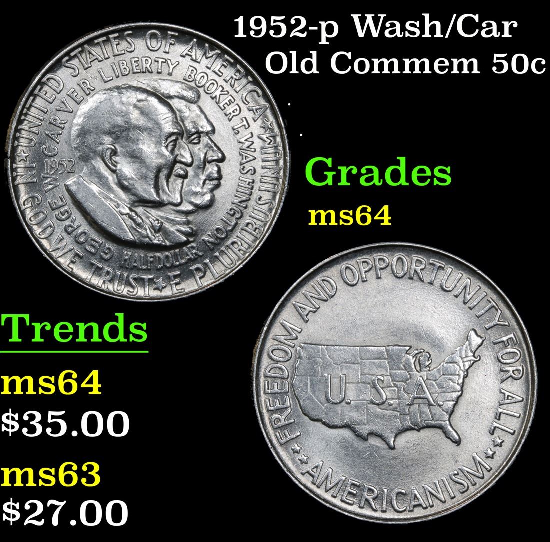 1952-p Wash/Car . . Old Commem Half Dollar 50c Grades Choice Unc. The Final Coin in the Old Commemorative Program. It was Minted to Revive the Ending Booker T Washington Commemorative and to Honor Washington Carver. When examining a Wash/Carver examine the High Points, which are Carver's cheek on the Obverse and the Center of the USA on the Reverse.