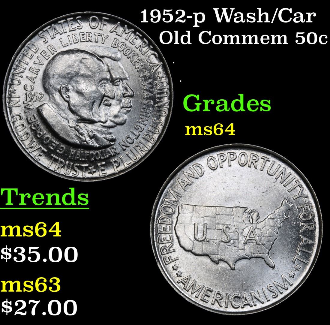 1952-p Wash/Car . . Old Commem Half Dollar 50c Grades Choice Unc. The Final Coin in the Old Commemorative Program. It was Minted to Revive the Ending Booker T Washington Commemorative and to Honor Washington Carver. When examining a Wash/Carver examine the High Points, which are Carver's cheek on the Obverse and the Center of the USA on the Reverse.
