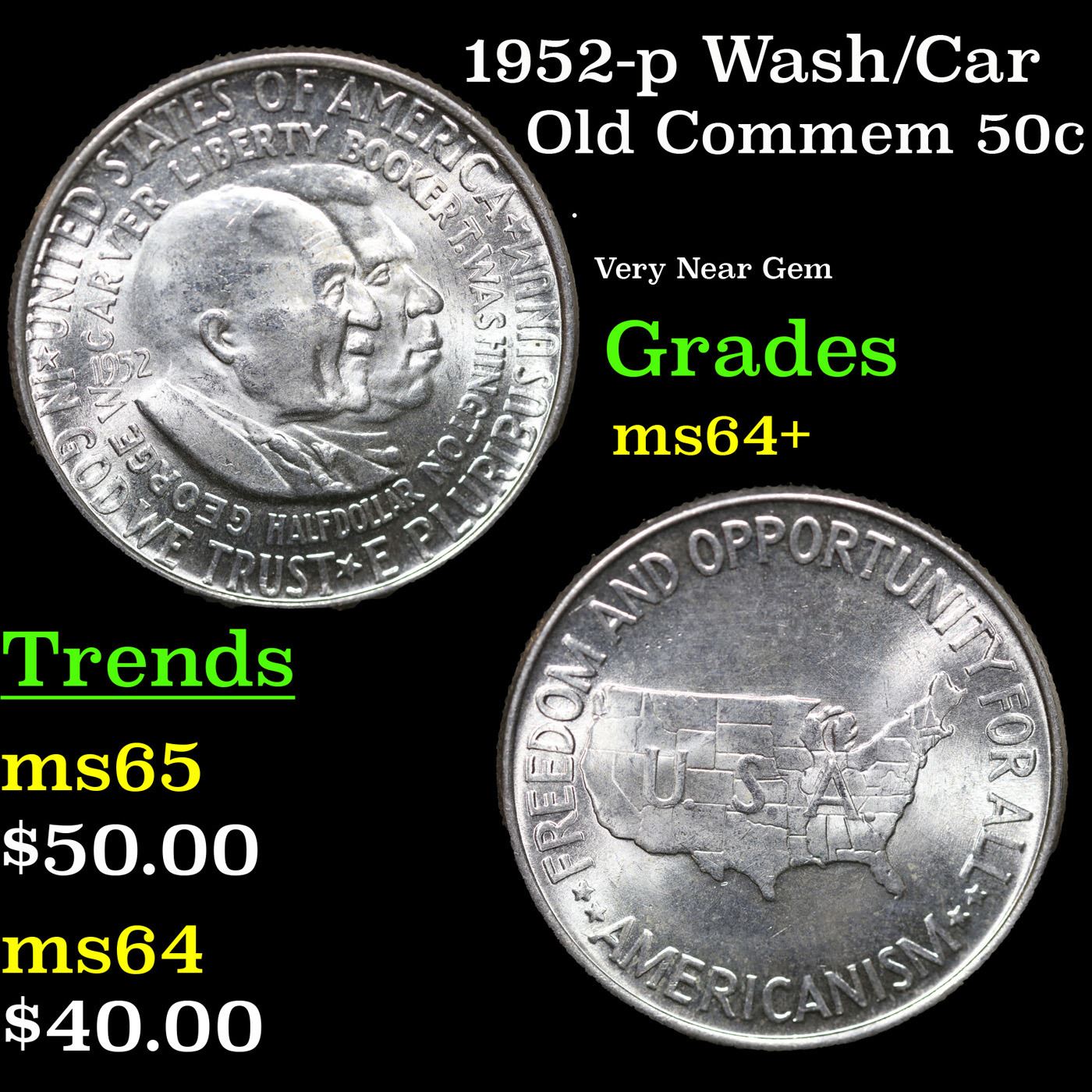 1952-p Wash/Car Old Commem Half Dollar 50c Grades Choice+ Unc. The Final Coin in the Old Commemorative Program. It was Minted to Revive the Ending Booker T Washington Commemorative and to Honor Washington Carver. When examining a Wash/Carver examine the High Points, which are Carver's cheek on the Obverse and the Center of the USA on the Reverse.
