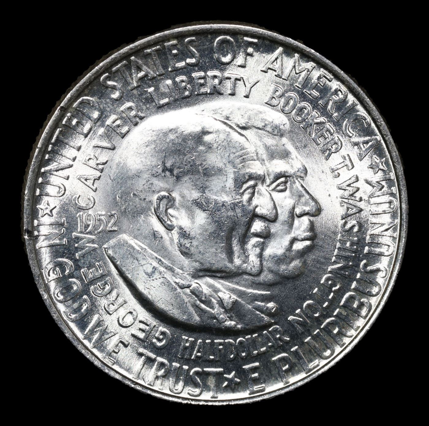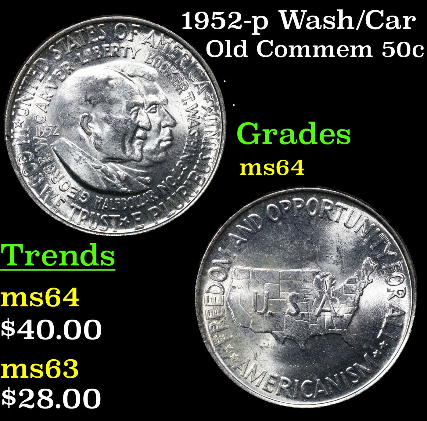 1952-p Wash/Car Old Commem Half Dollar 50c Grades Choice Unc. The Final Coin in the Old Commemorative Program. It was Minted to Revive the Ending Booker T Washington Commemorative and to Honor Washington Carver. When examining a Wash/Carver examine the High Points, which are Carver's cheek on the Obverse and the Center of the USA on the Reverse.