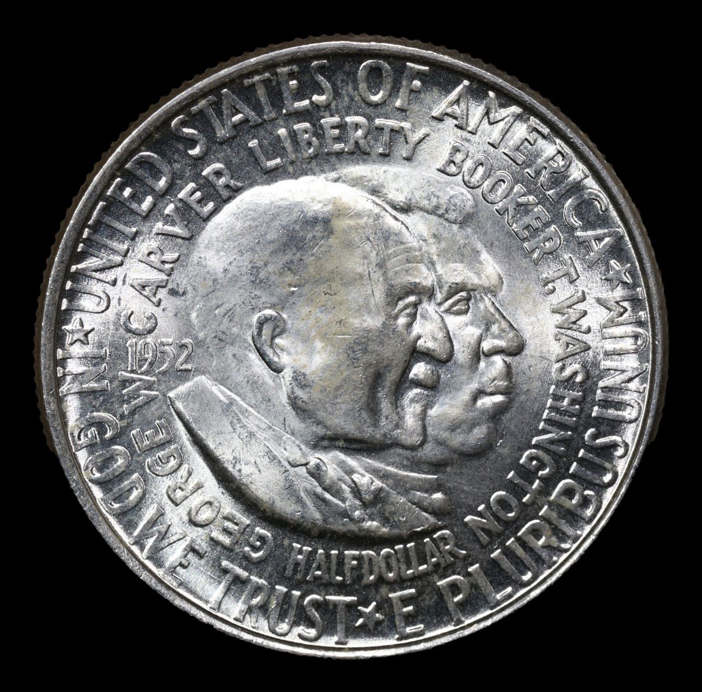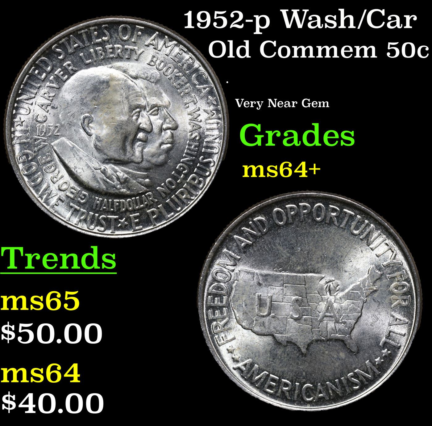 1952-p Wash/Car Old Commem Half Dollar 50c Grades Choice+ Unc. The Final Coin in the Old Commemorative Program. It was Minted to Revive the Ending Booker T Washington Commemorative and to Honor Washington Carver. When examining a Wash/Carver examine the High Points, which are Carver's cheek on the Obverse and the Center of the USA on the Reverse.