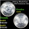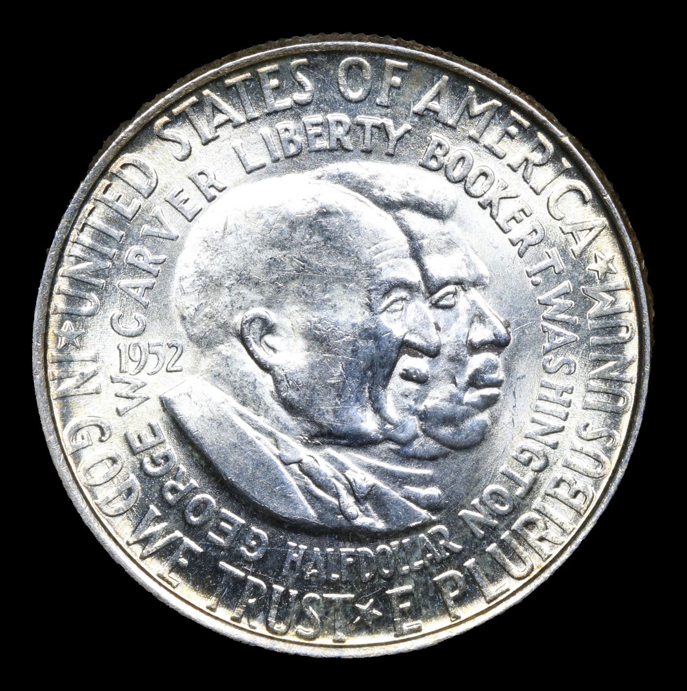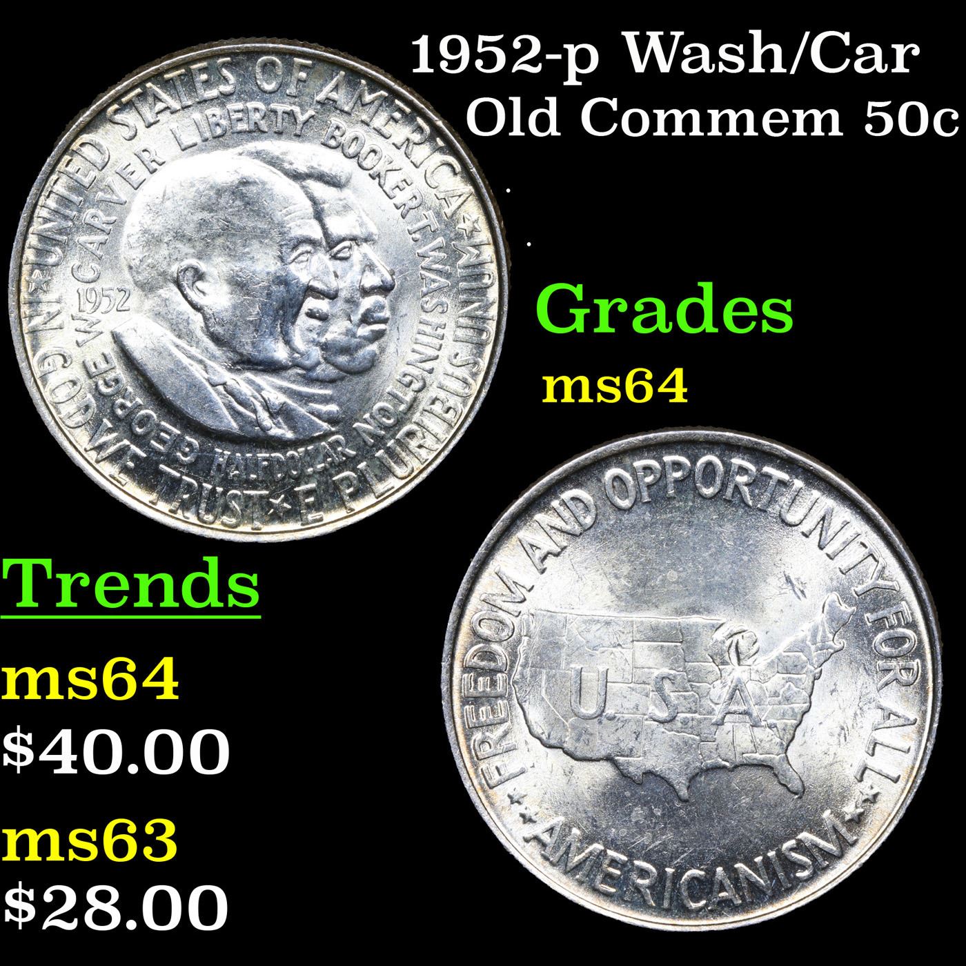 1952-p Wash/Car Old Commem Half Dollar 50c Grades Choice Unc. The Final Coin in the Old Commemorative Program. It was Minted to Revive the Ending Booker T Washington Commemorative and to Honor Washington Carver. When examining a Wash/Carver examine the High Points, which are Carver's cheek on the Obverse and the Center of the USA on the Reverse.