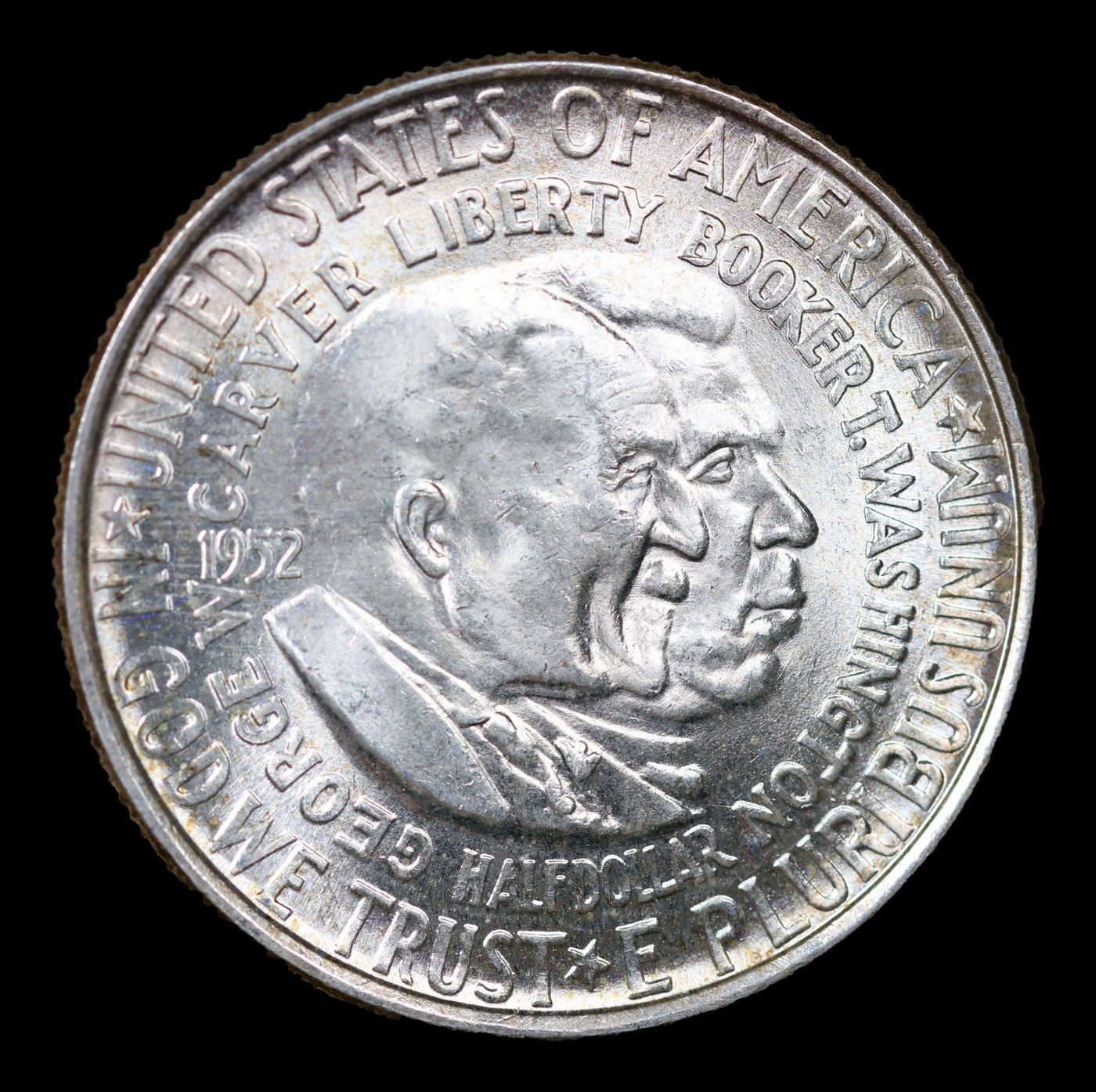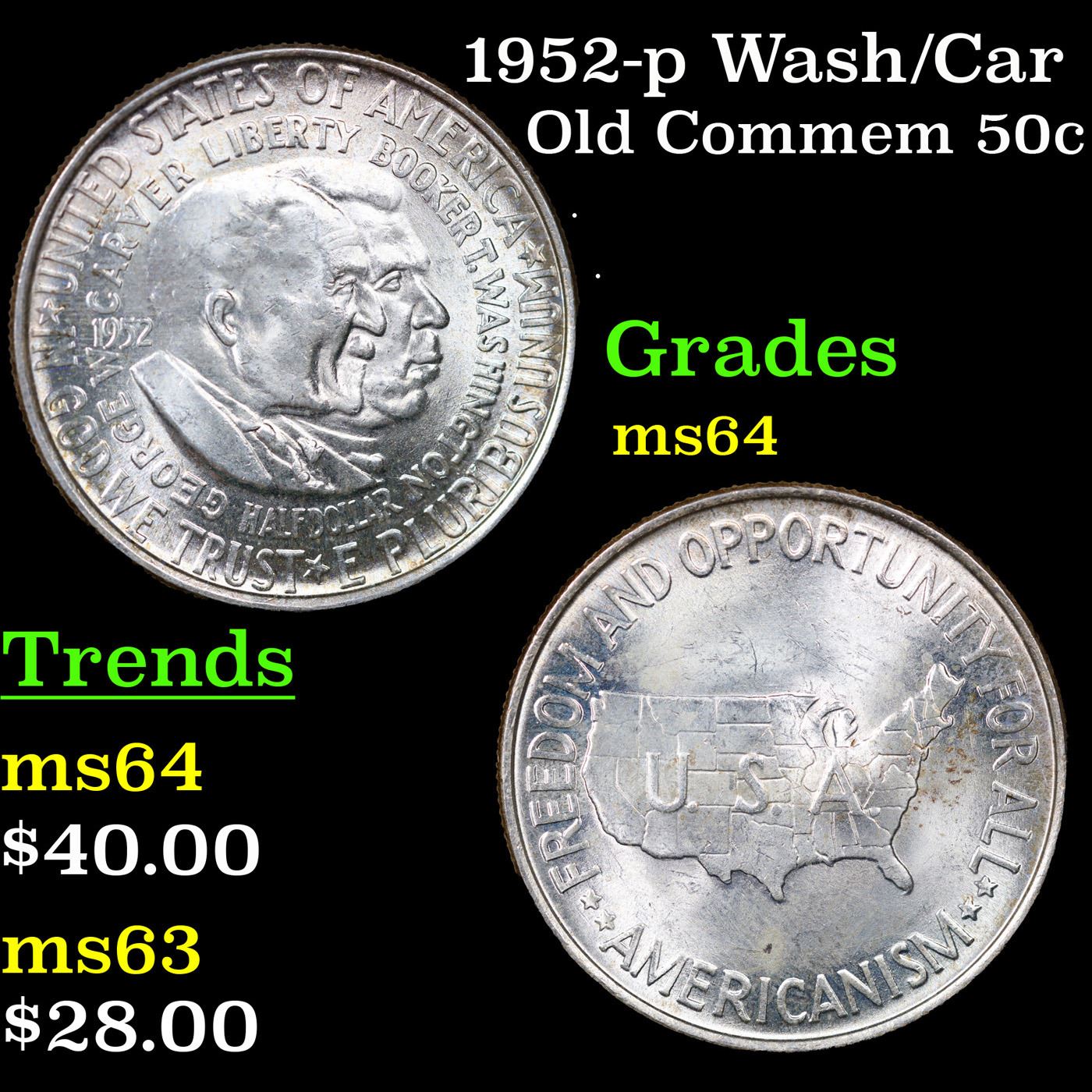 1952-p Wash/Car Old Commem Half Dollar 50c Grades Choice Unc. The Final Coin in the Old Commemorative Program. It was Minted to Revive the Ending Booker T Washington Commemorative and to Honor Washington Carver. When examining a Wash/Carver examine the High Points, which are Carver's cheek on the Obverse and the Center of the USA on the Reverse.