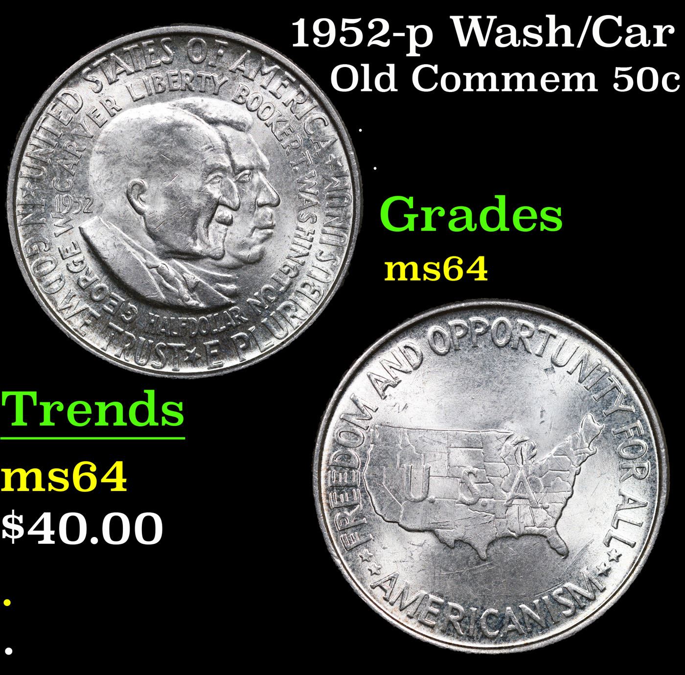1952-p Wash/Car Old Commem Half Dollar 50c Grades Choice Unc. The Final Coin in the Old Commemorative Program. It was Minted to Revive the Ending Booker T Washington Commemorative and to Honor Washington Carver. When examining a Wash/Carver examine the High Points, which are Carver's cheek on the Obverse and the Center of the USA on the Reverse.