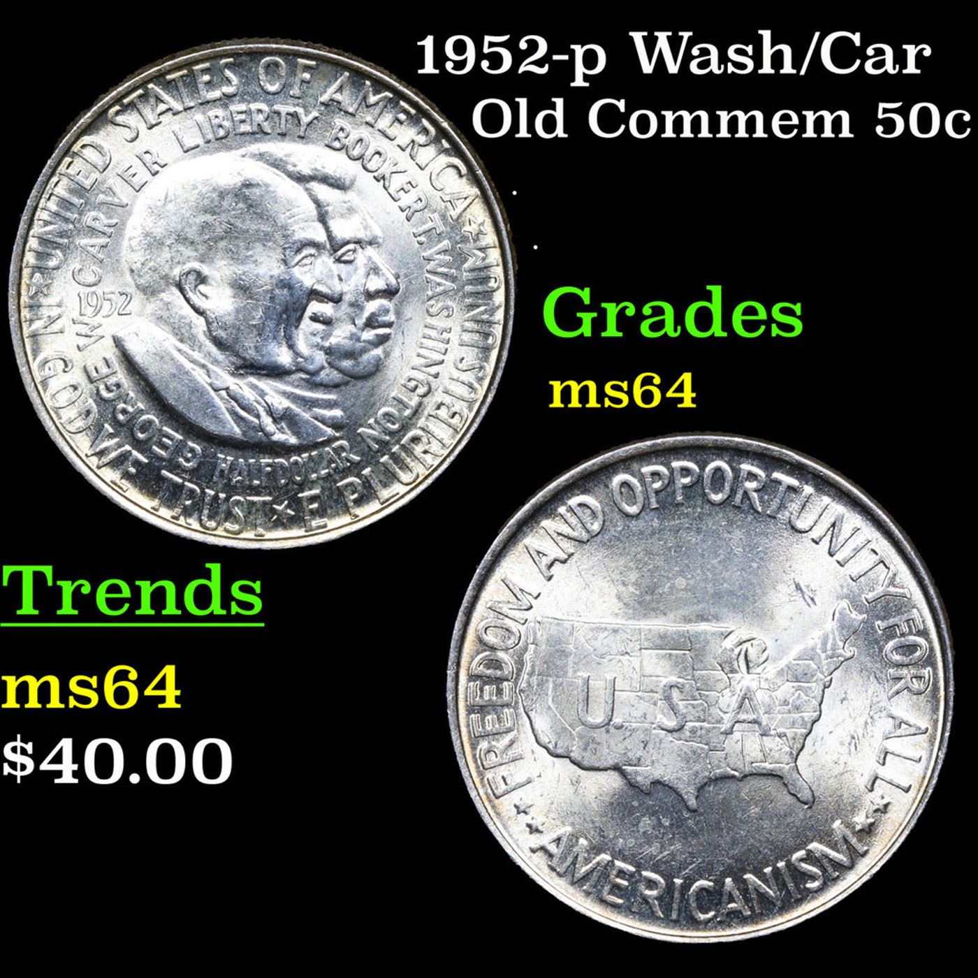 1952-p Wash/Car Old Commem Half Dollar 50c Grades Choice Unc. The Final Coin in the Old Commemorative Program. It was Minted to Revive the Ending Booker T Washington Commemorative and to Honor Washington Carver. When examining a Wash/Carver examine the High Points, which are Carver's cheek on the Obverse and the Center of the USA on the Reverse.