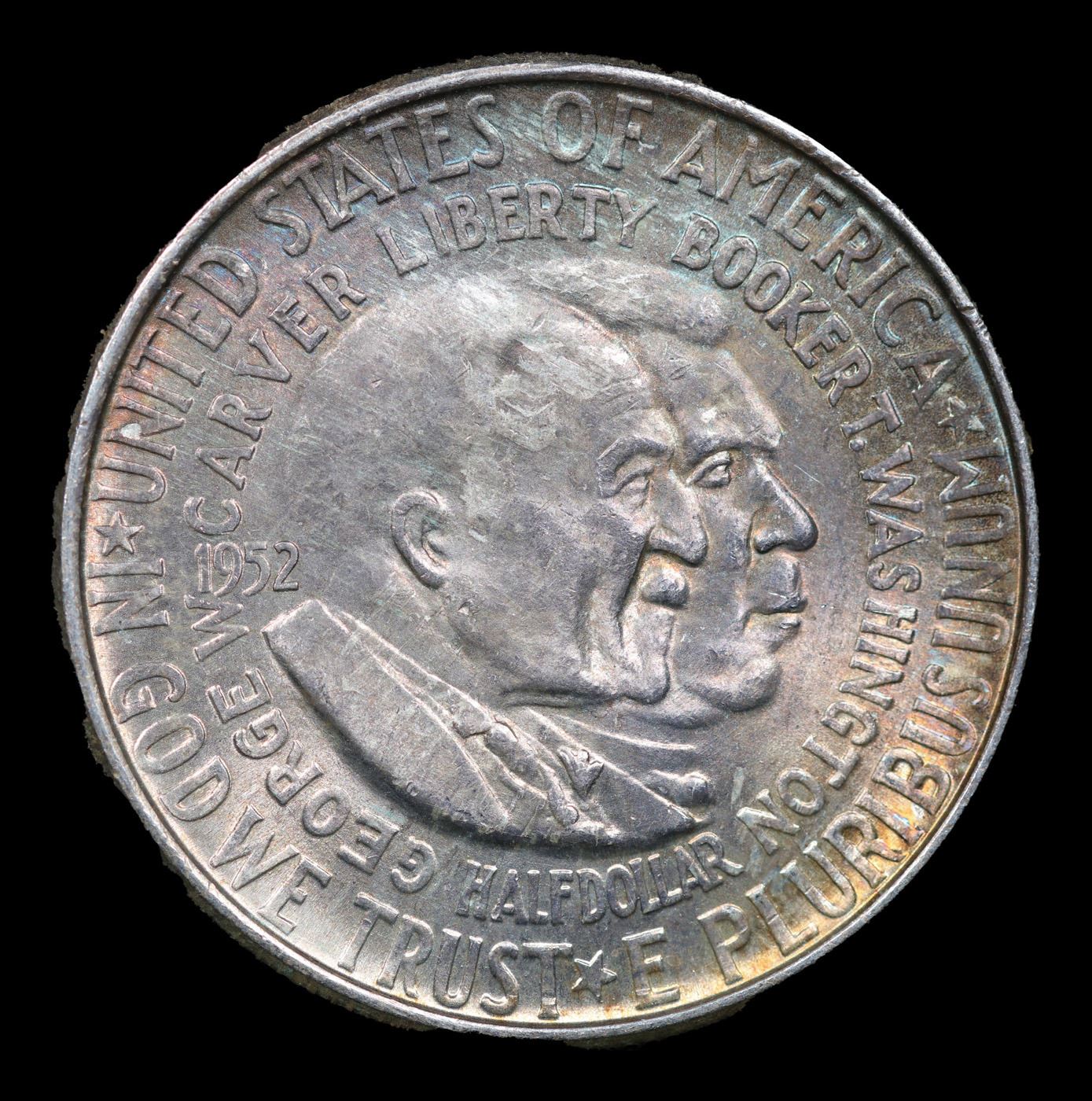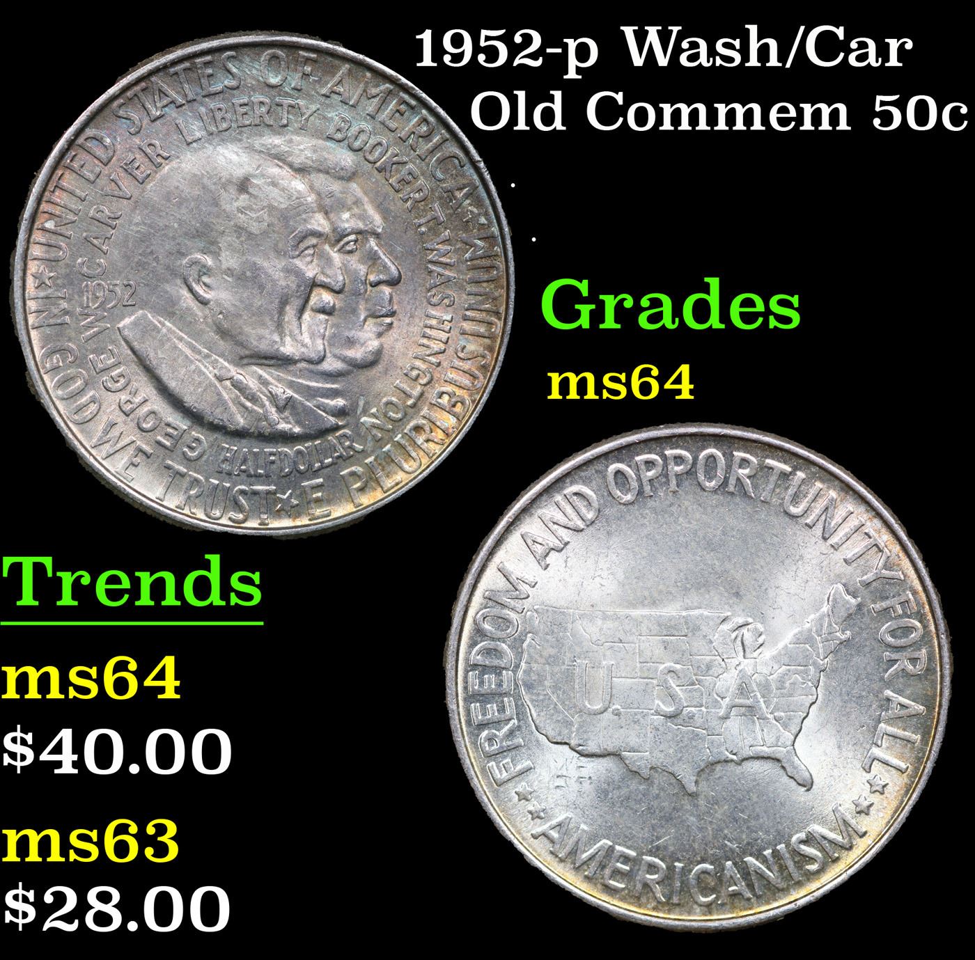 1952-p Wash/Car Old Commem Half Dollar 50c Grades Choice Unc. The Final Coin in the Old Commemorative Program. It was Minted to Revive the Ending Booker T Washington Commemorative and to Honor Washington Carver. When examining a Wash/Carver examine the High Points, which are Carver's cheek on the Obverse and the Center of the USA on the Reverse.