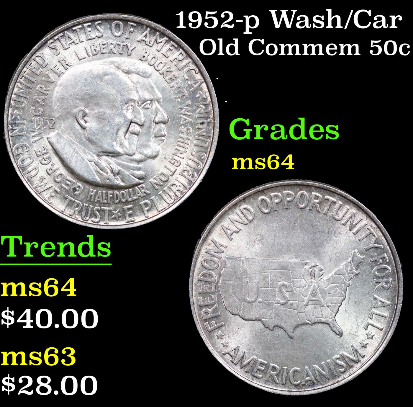 1952-p Wash/Car Old Commem Half Dollar 50c Grades Choice Unc. The Final Coin in the Old Commemorative Program. It was Minted to Revive the Ending Booker T Washington Commemorative and to Honor Washington Carver. When examining a Wash/Carver examine the High Points, which are Carver's cheek on the Obverse and the Center of the USA on the Reverse.