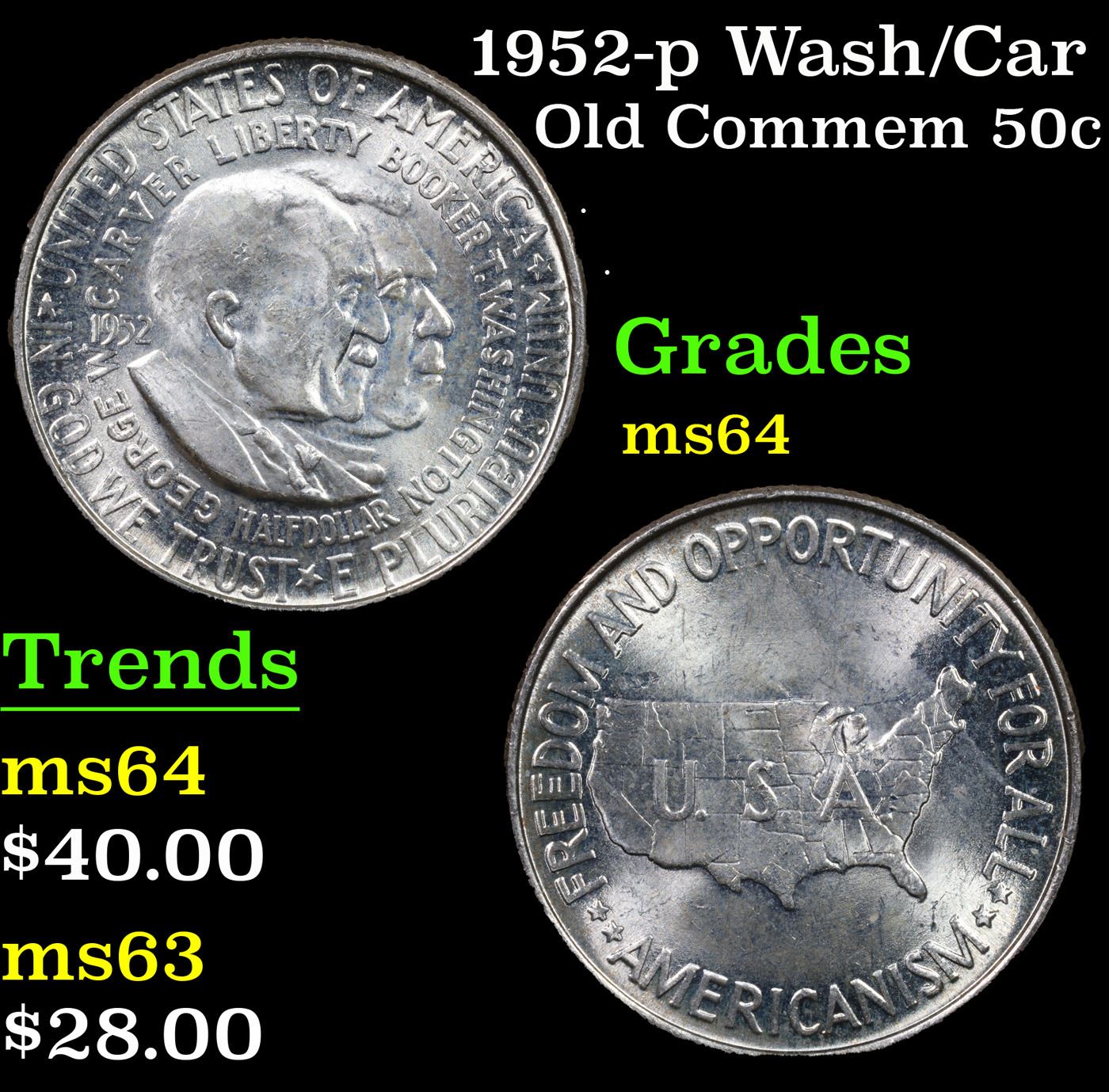 1952-p Wash/Car Old Commem Half Dollar 50c Grades Choice Unc. The Final Coin in the Old Commemorative Program. It was Minted to Revive the Ending Booker T Washington Commemorative and to Honor Washington Carver. When examining a Wash/Carver examine the High Points, which are Carver's cheek on the Obverse and the Center of the USA on the Reverse.