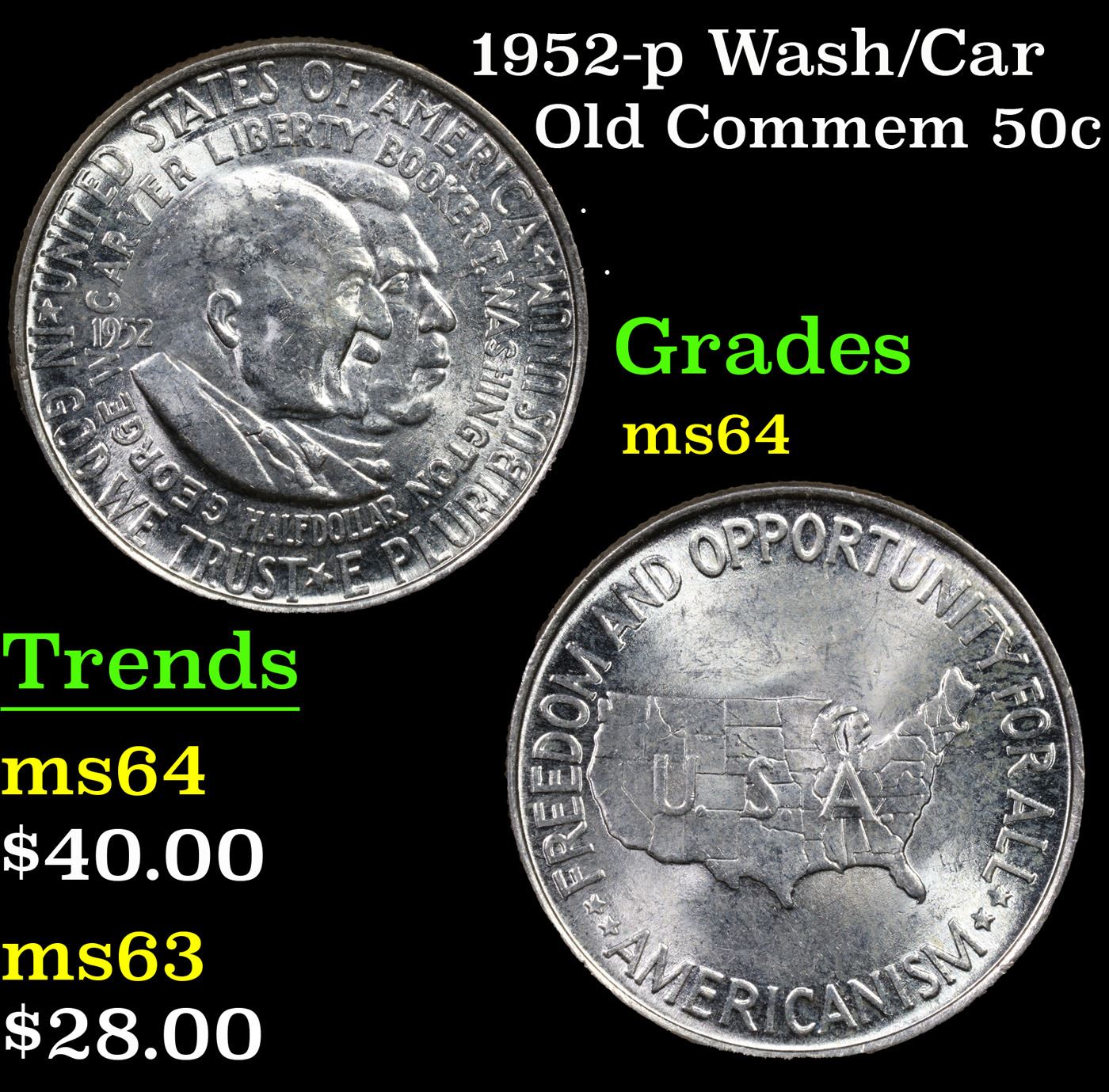 1952-p Wash/Car Old Commem Half Dollar 50c Grades Choice Unc. The Final Coin in the Old Commemorative Program. It was Minted to Revive the Ending Booker T Washington Commemorative and to Honor Washington Carver. When examining a Wash/Carver examine the High Points, which are Carver's cheek on the Obverse and the Center of the USA on the Reverse.