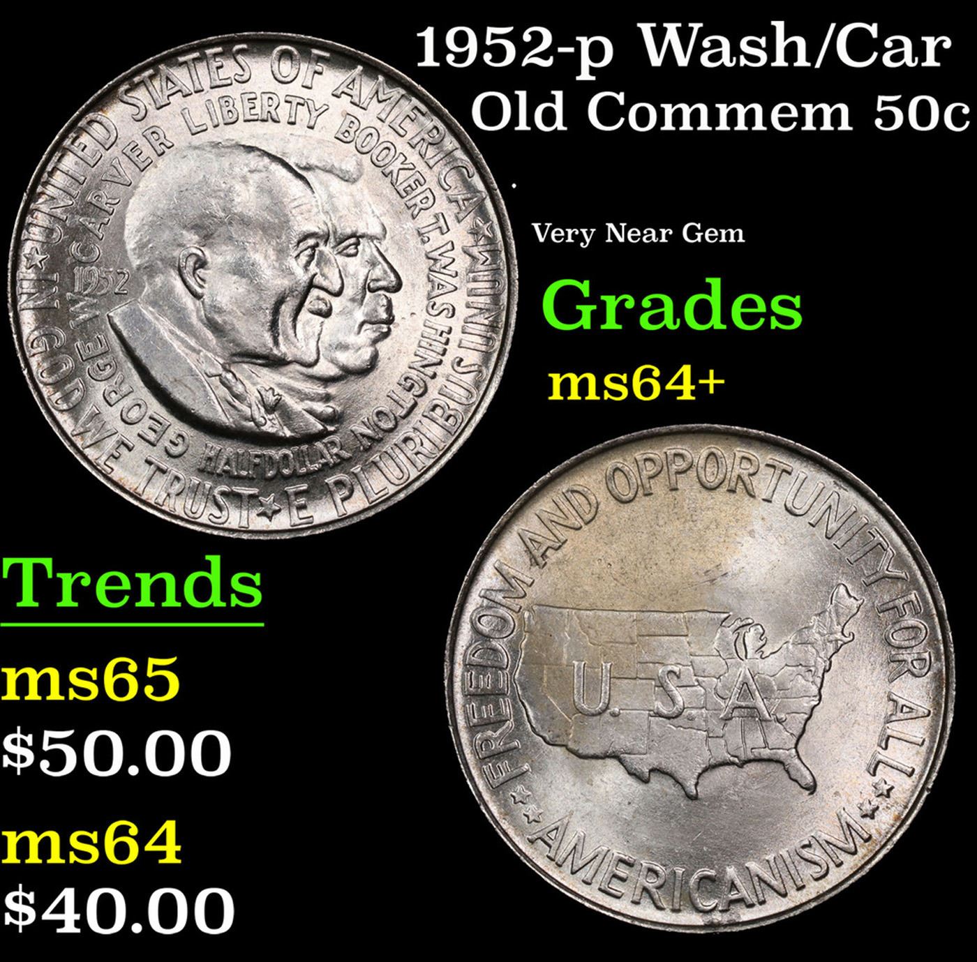 1952-p Wash/Car Old Commem Half Dollar 50c Grades Choice+ Unc. The Final Coin in the Old Commemorative Program. It was Minted to Revive the Ending Booker T Washington Commemorative and to Honor Washington Carver. When examining a Wash/Carver examine the High Points, which are Carver's cheek on the Obverse and the Center of the USA on the Reverse.