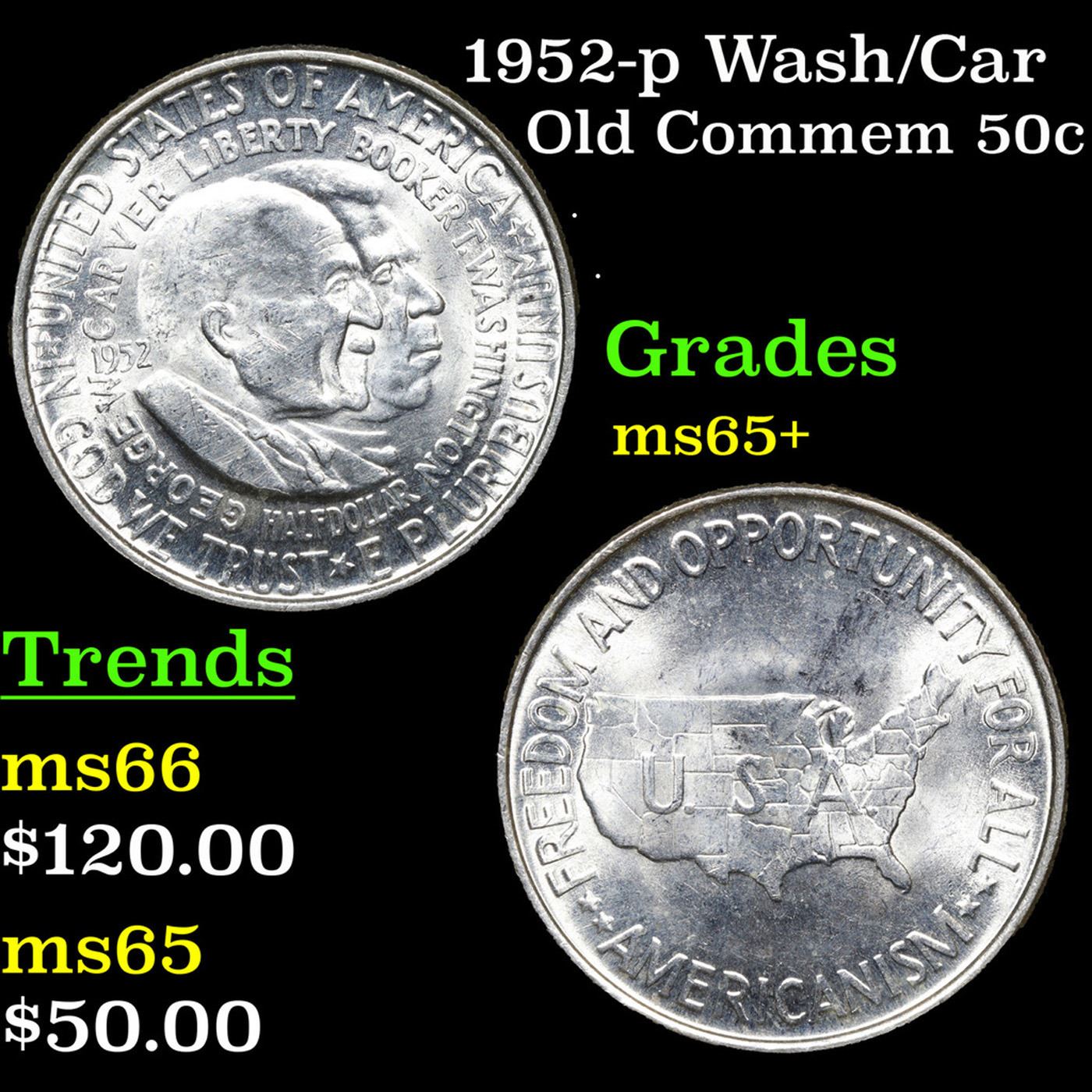 1952-p Wash/Car Old Commem Half Dollar 50c Grades GEM+ Unc. The Final Coin in the Old Commemorative Program. It was Minted to Revive the Ending Booker T Washington Commemorative and to Honor Washington Carver. When examining a Wash/Carver examine the High Points, which are Carver's cheek on the Obverse and the Center of the USA on the Reverse.