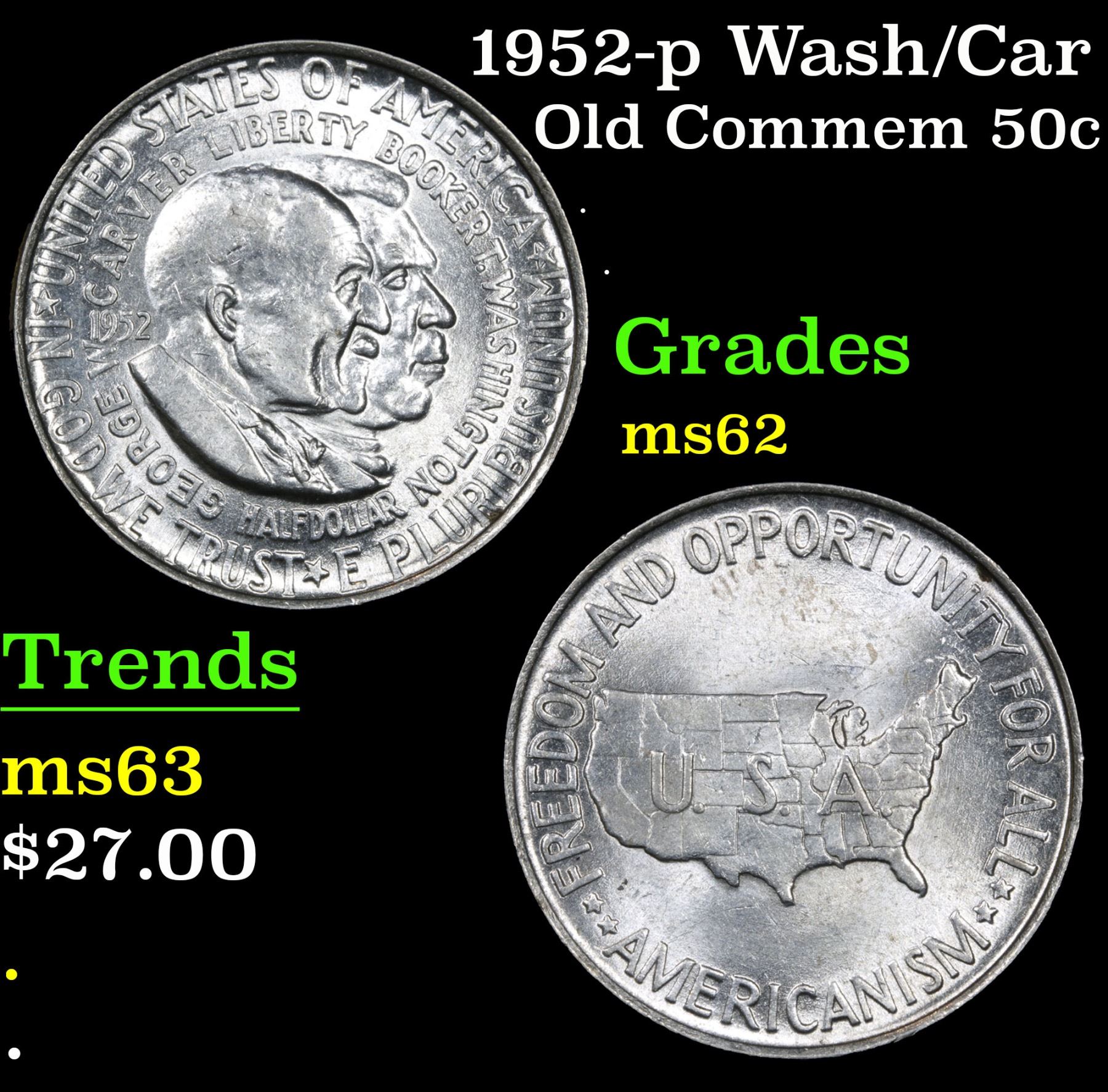 1952-p Wash/Car Old Commem Half Dollar 50c Grades Select Unc. The Final Coin in the Old Commemorative Program. It was Minted to Revive the Ending Booker T Washington Commemorative and to Honor Washington Carver. When examining a Wash/Carver examine the High Points, which are Carver's cheek on the Obverse and the Center of the USA on the Reverse.