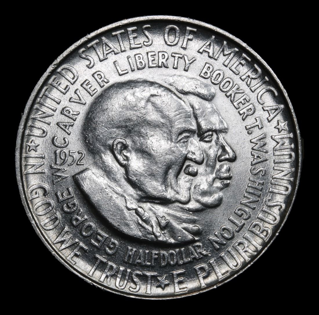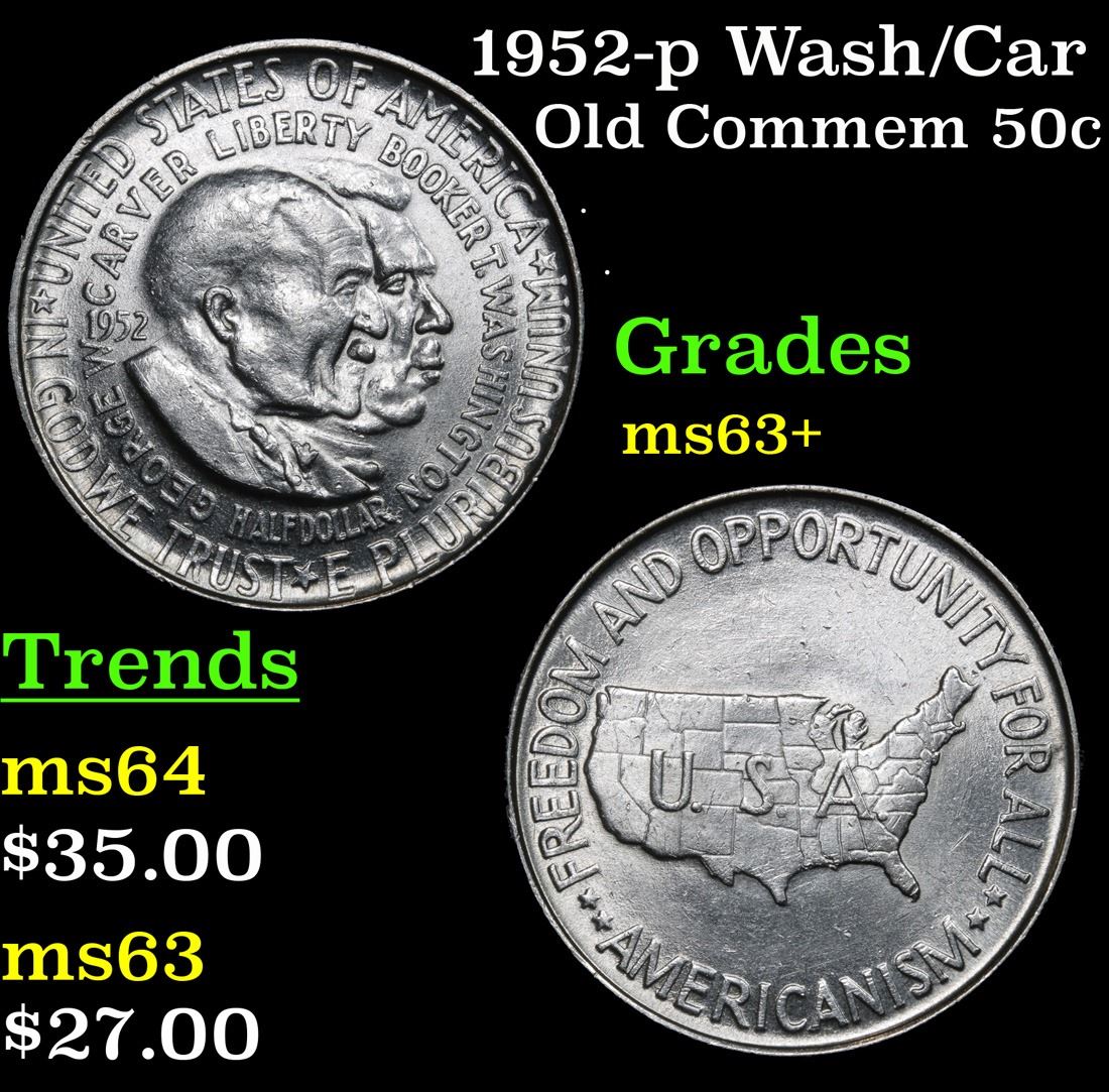 1952-p Wash/Car . . Old Commem Half Dollar 50c Grades Select+ Unc. The Final Coin in the Old Commemorative Program. It was Minted to Revive the Ending Booker T Washington Commemorative and to Honor Washington Carver. When examining a Wash/Carver examine the High Points, which are Carver's cheek on the Obverse and the Center of the USA on the Reverse.