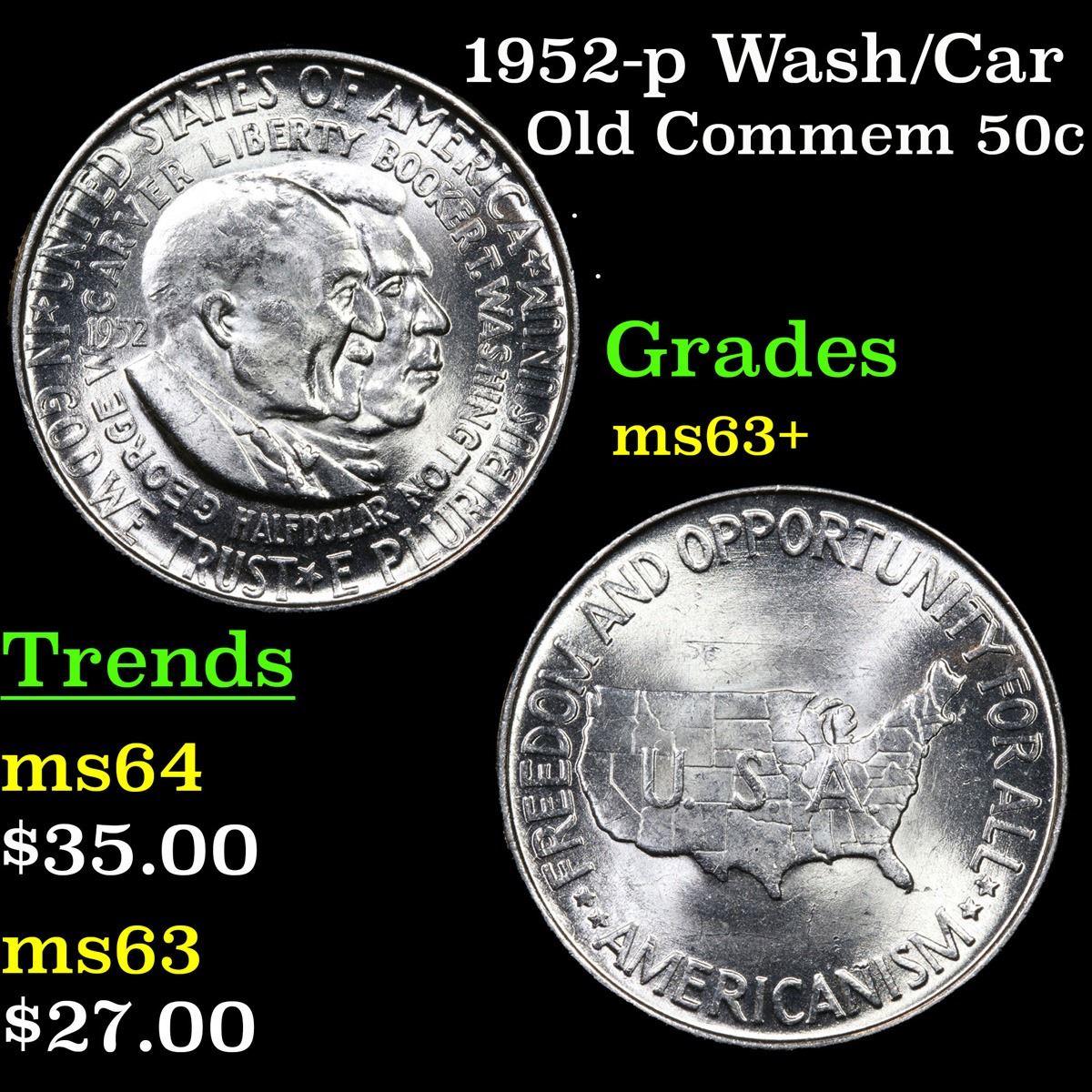 1952-p Wash/Car . . Old Commem Half Dollar 50c Grades Select+ Unc. The Final Coin in the Old Commemorative Program. It was Minted to Revive the Ending Booker T Washington Commemorative and to Honor Washington Carver. When examining a Wash/Carver examine the High Points, which are Carver's cheek on the Obverse and the Center of the USA on the Reverse.