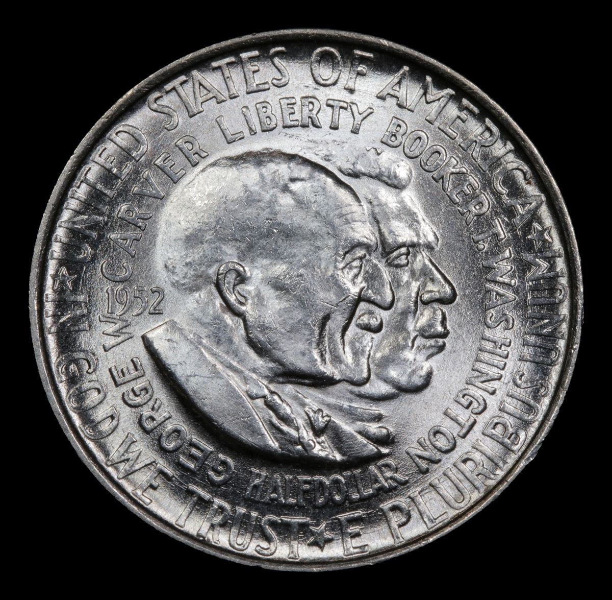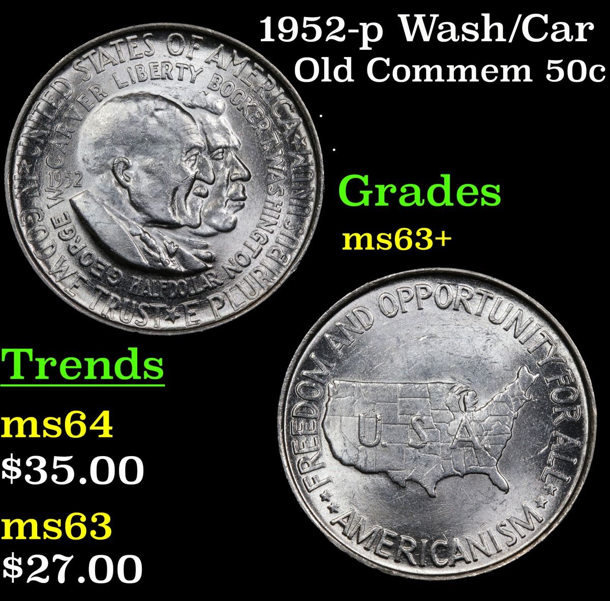 1952-p Wash/Car Old Commem Half Dollar 50c Grades Select+ Unc. The Final Coin in the Old Commemorative Program. It was Minted to Revive the Ending Booker T Washington Commemorative and to Honor Washington Carver. When examining a Wash/Carver examine the High Points, which are Carver's cheek on the Obverse and the Center of the USA on the Reverse.