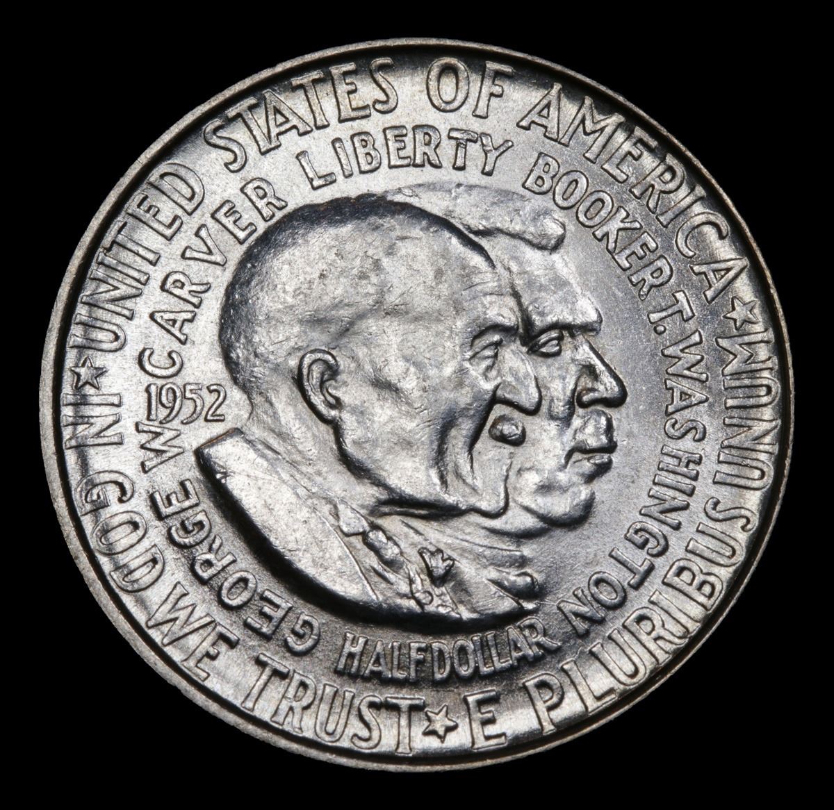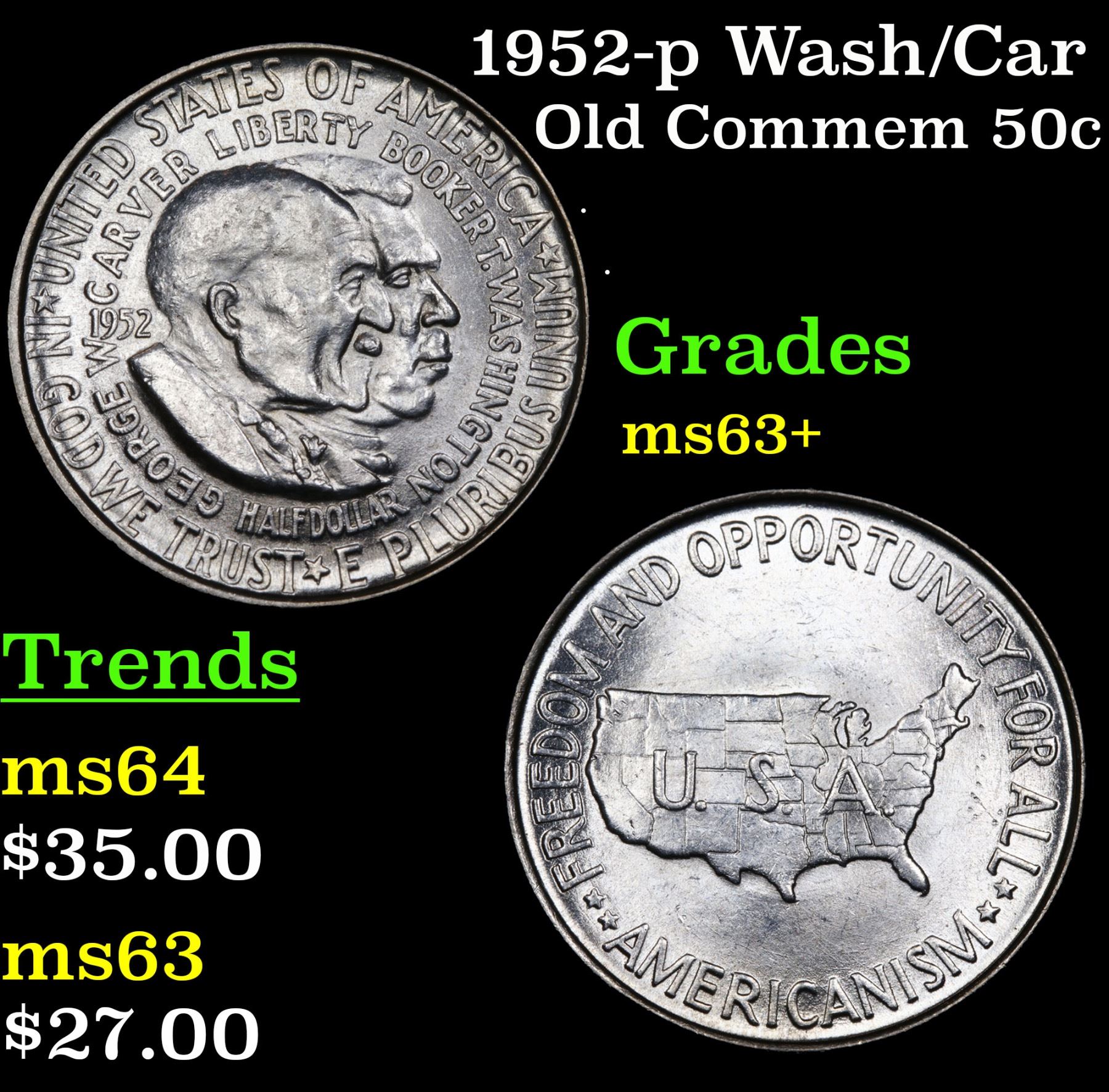 1952-p Wash/Car Old Commem Half Dollar 50c Grades Select+ Unc. The Final Coin in the Old Commemorative Program. It was Minted to Revive the Ending Booker T Washington Commemorative and to Honor Washington Carver. When examining a Wash/Carver examine the High Points, which are Carver's cheek on the Obverse and the Center of the USA on the Reverse.