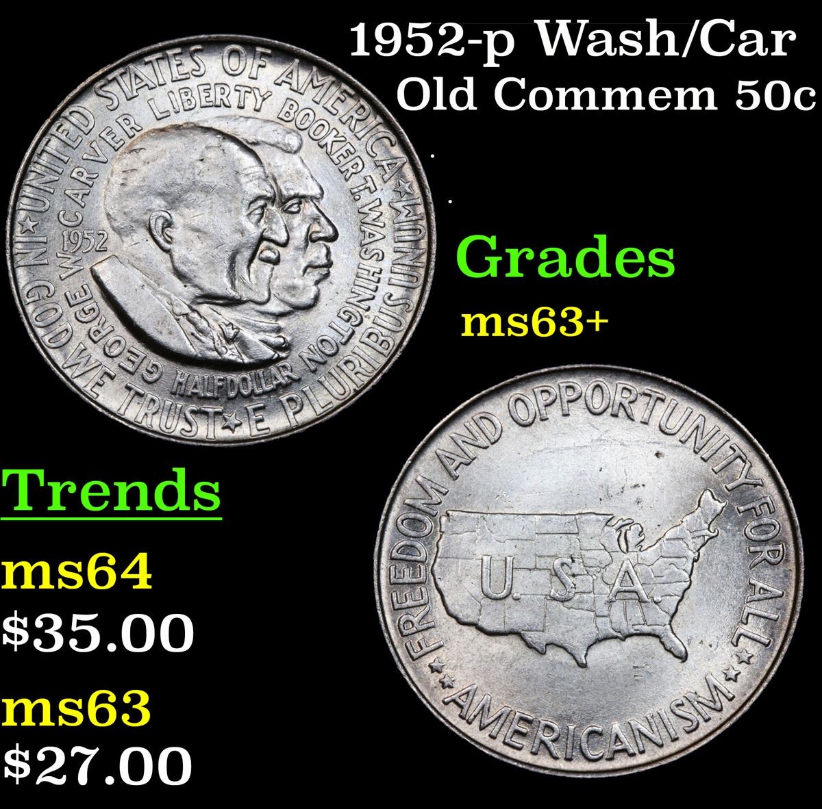 1952-p Wash/Car Old Commem Half Dollar 50c Grades Select+ Unc. The Final Coin in the Old Commemorative Program. It was Minted to Revive the Ending Booker T Washington Commemorative and to Honor Washington Carver. When examining a Wash/Carver examine the High Points, which are Carver's cheek on the Obverse and the Center of the USA on the Reverse.