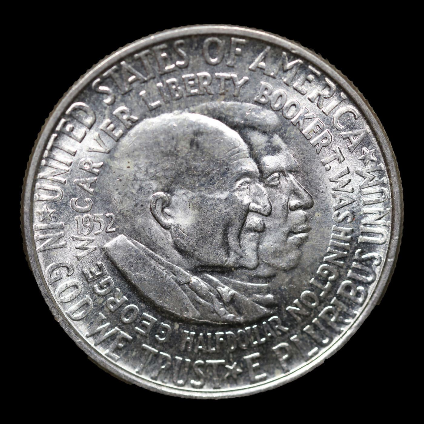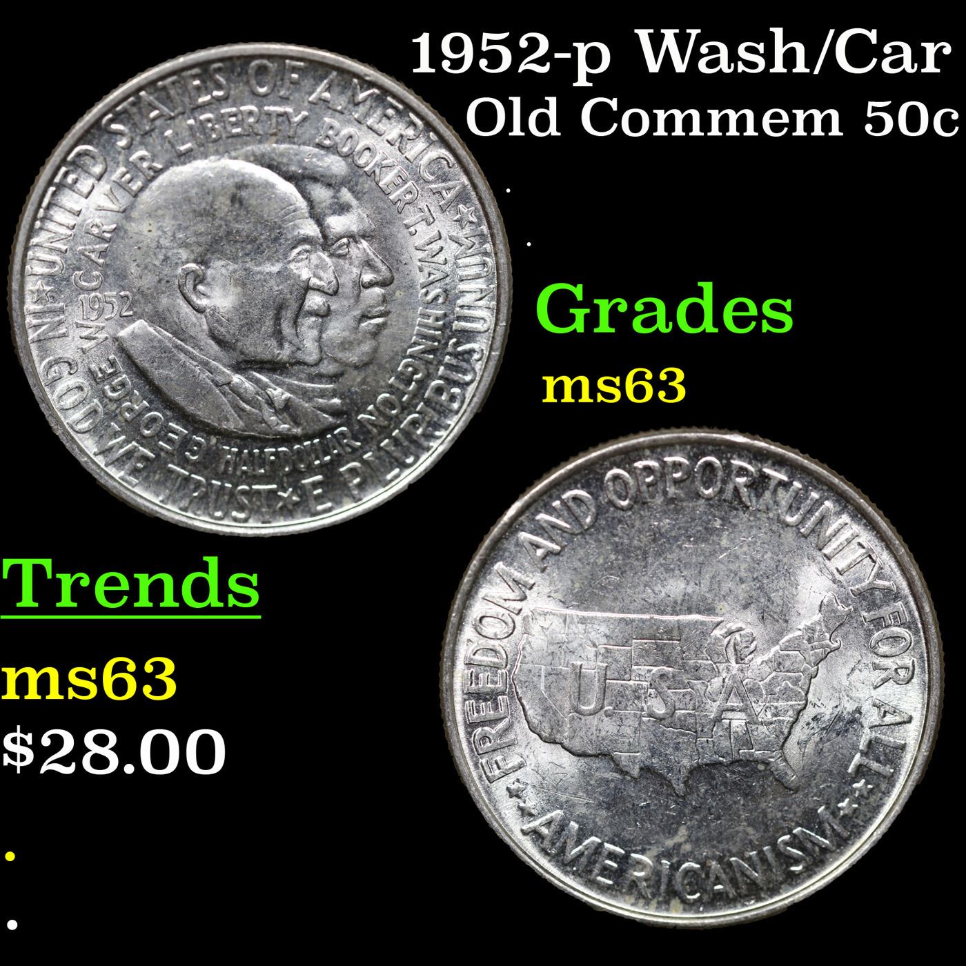 1952-p Wash/Car Old Commem Half Dollar 50c Grades Select Unc. The Final Coin in the Old Commemorative Program. It was Minted to Revive the Ending Booker T Washington Commemorative and to Honor Washington Carver. When examining a Wash/Carver examine the High Points, which are Carver's cheek on the Obverse and the Center of the USA on the Reverse.