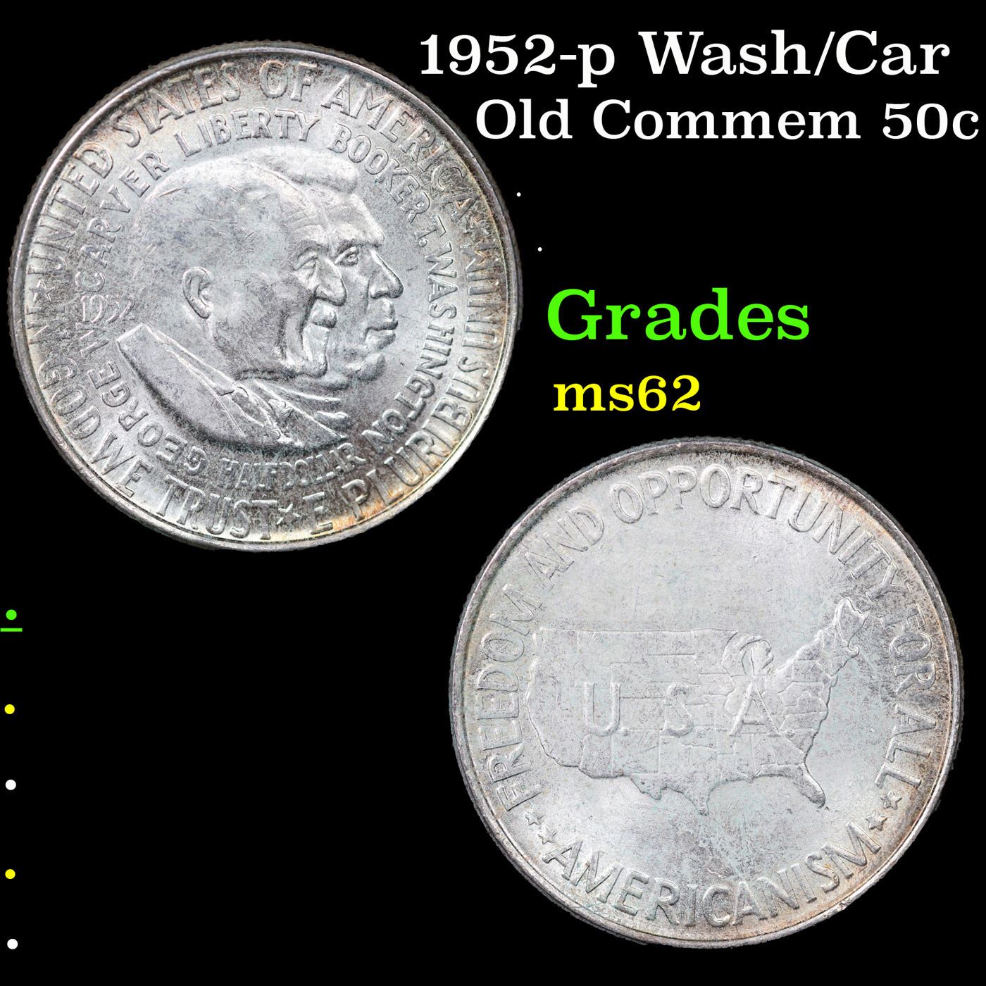 1952-p Wash/Car Old Commem Half Dollar 50c Grades Select Unc. The Final Coin in the Old Commemorative Program. It was Minted to Revive the Ending Booker T Washington Commemorative and to Honor Washington Carver. When examining a Wash/Carver examine the High Points, which are Carver's cheek on the Obverse and the Center of the USA on the Reverse.
