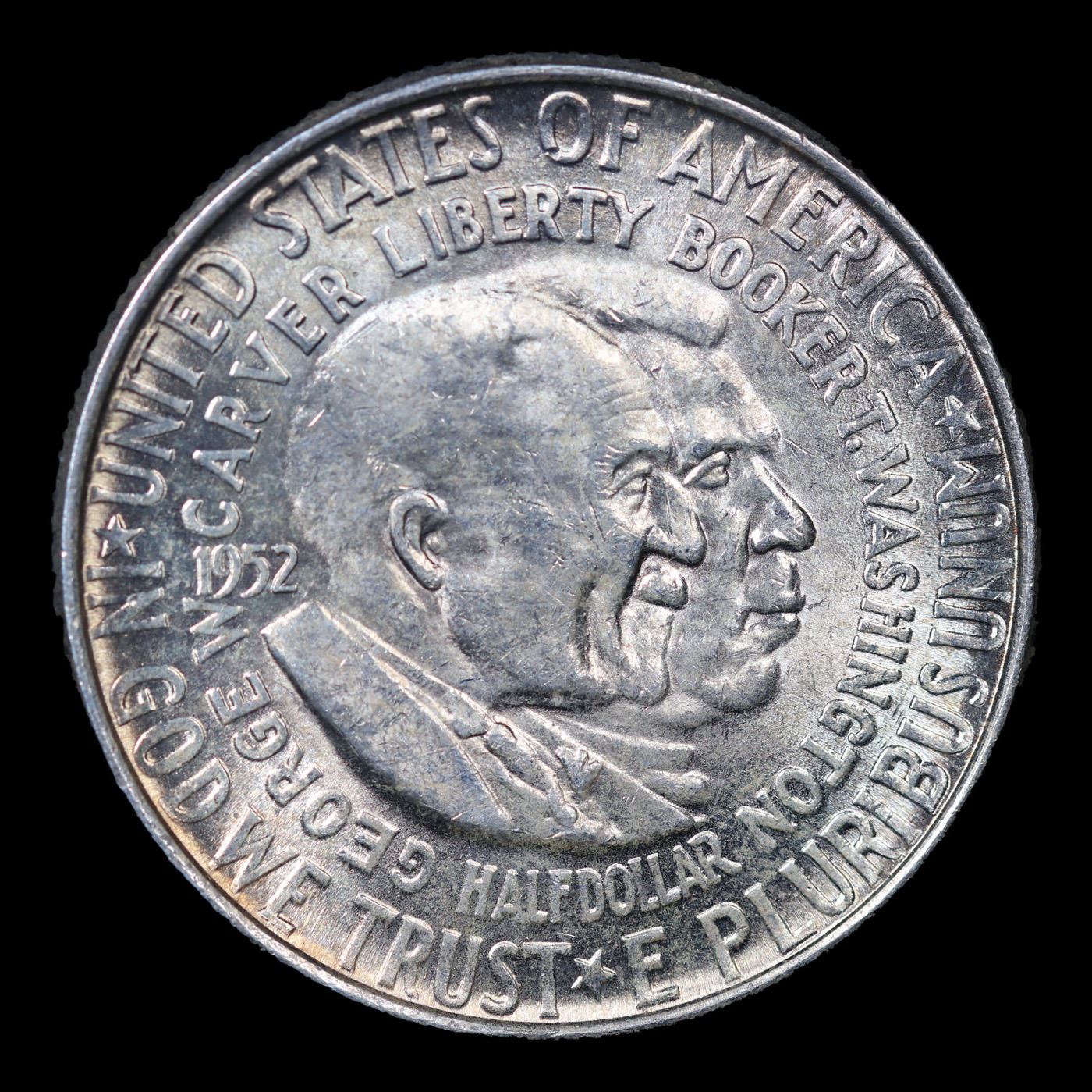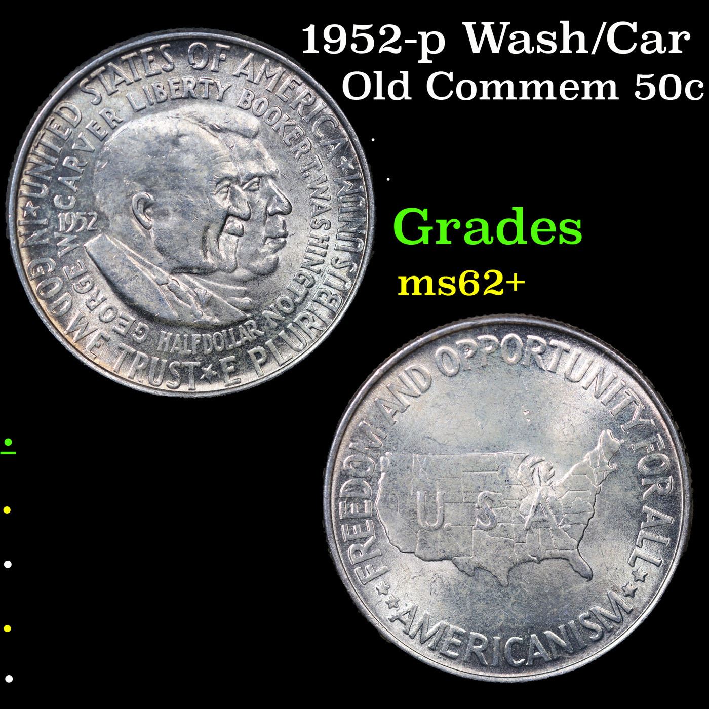 1952-p Wash/Car Old Commem Half Dollar 50c Grades Select Unc. The Final Coin in the Old Commemorative Program. It was Minted to Revive the Ending Booker T Washington Commemorative and to Honor Washington Carver. When examining a Wash/Carver examine the High Points, which are Carver's cheek on the Obverse and the Center of the USA on the Reverse.