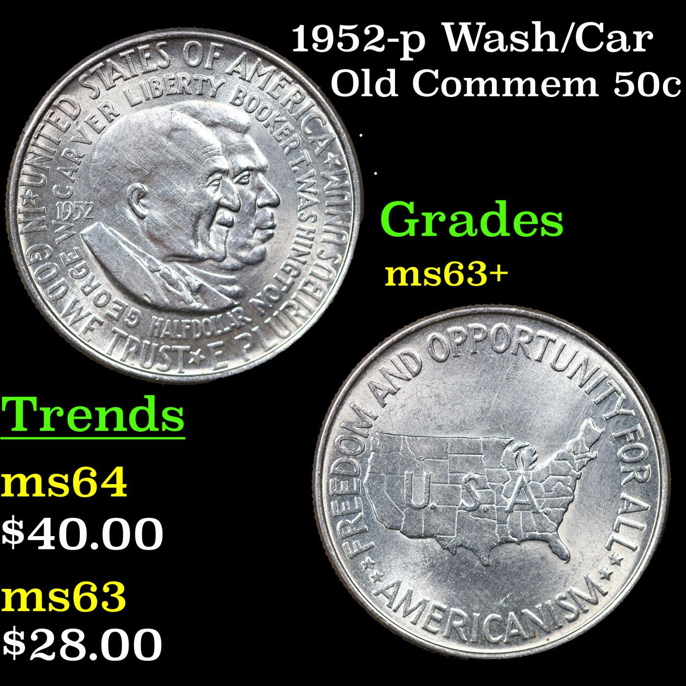 1952-p Wash/Car Old Commem Half Dollar 50c Grades Select+ Unc. The Final Coin in the Old Commemorative Program. It was Minted to Revive the Ending Booker T Washington Commemorative and to Honor Washington Carver. When examining a Wash/Carver examine the High Points, which are Carver's cheek on the Obverse and the Center of the USA on the Reverse.