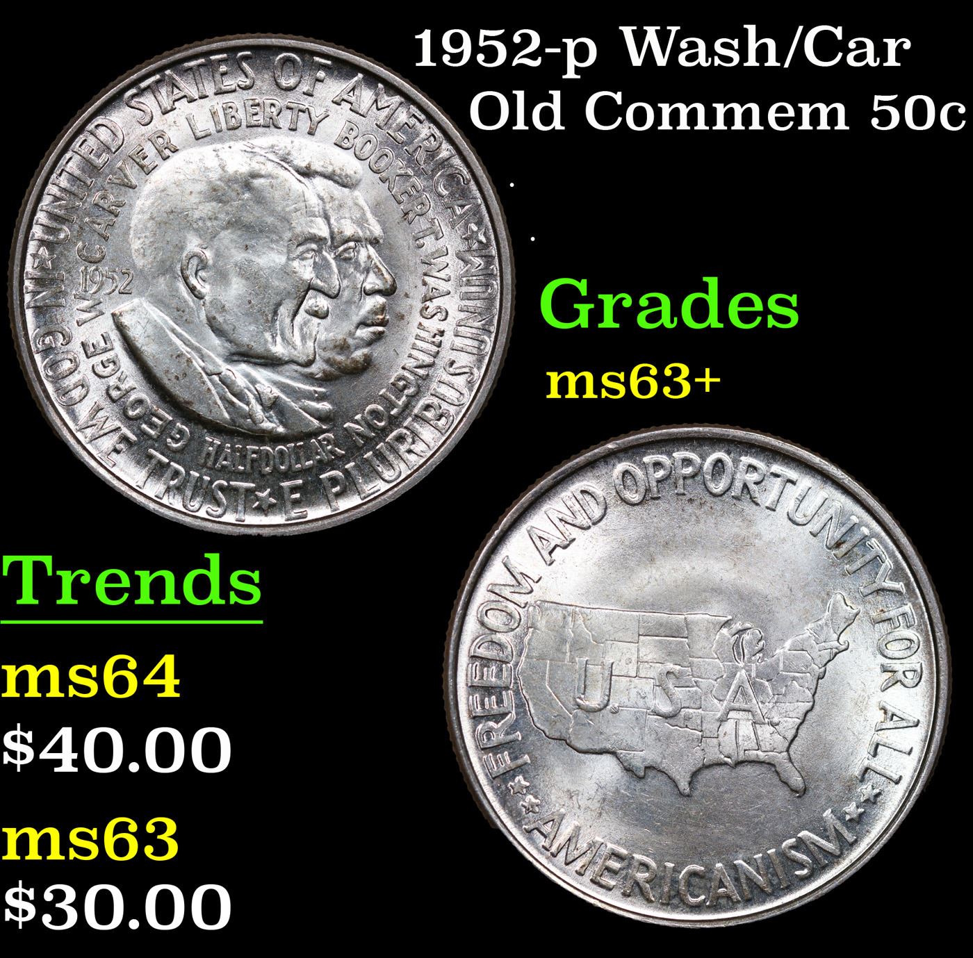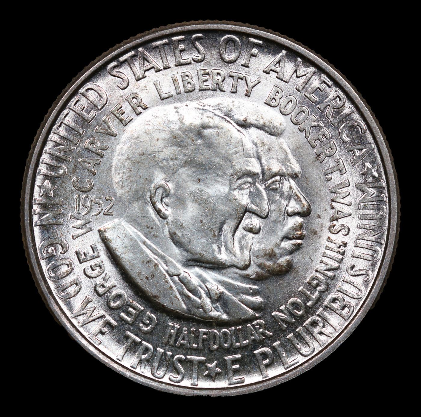 1952-p Wash/Car Old Commem Half Dollar 50c Grades Select+ Unc. The Final Coin in the Old Commemorative Program. It was Minted to Revive the Ending Booker T Washington Commemorative and to Honor Washington Carver. When examining a Wash/Carver examine the High Points, which are Carver's cheek on the Obverse and the Center of the USA on the Reverse.