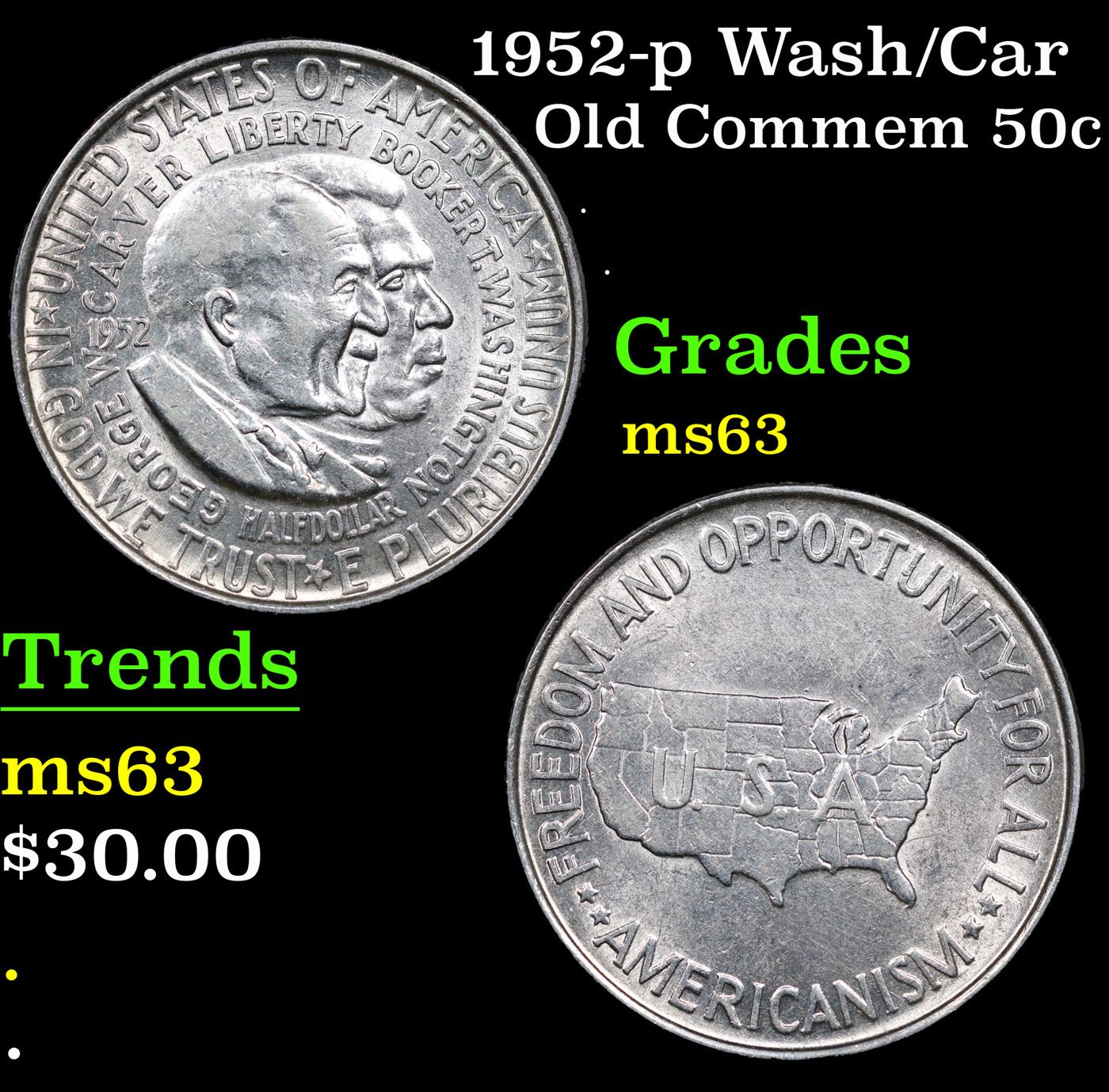 1952-p Wash/Car Old Commem Half Dollar 50c Grades Select Unc. The Final Coin in the Old Commemorative Program. It was Minted to Revive the Ending Booker T Washington Commemorative and to Honor Washington Carver. When examining a Wash/Carver examine the High Points, which are Carver's cheek on the Obverse and the Center of the USA on the Reverse.
