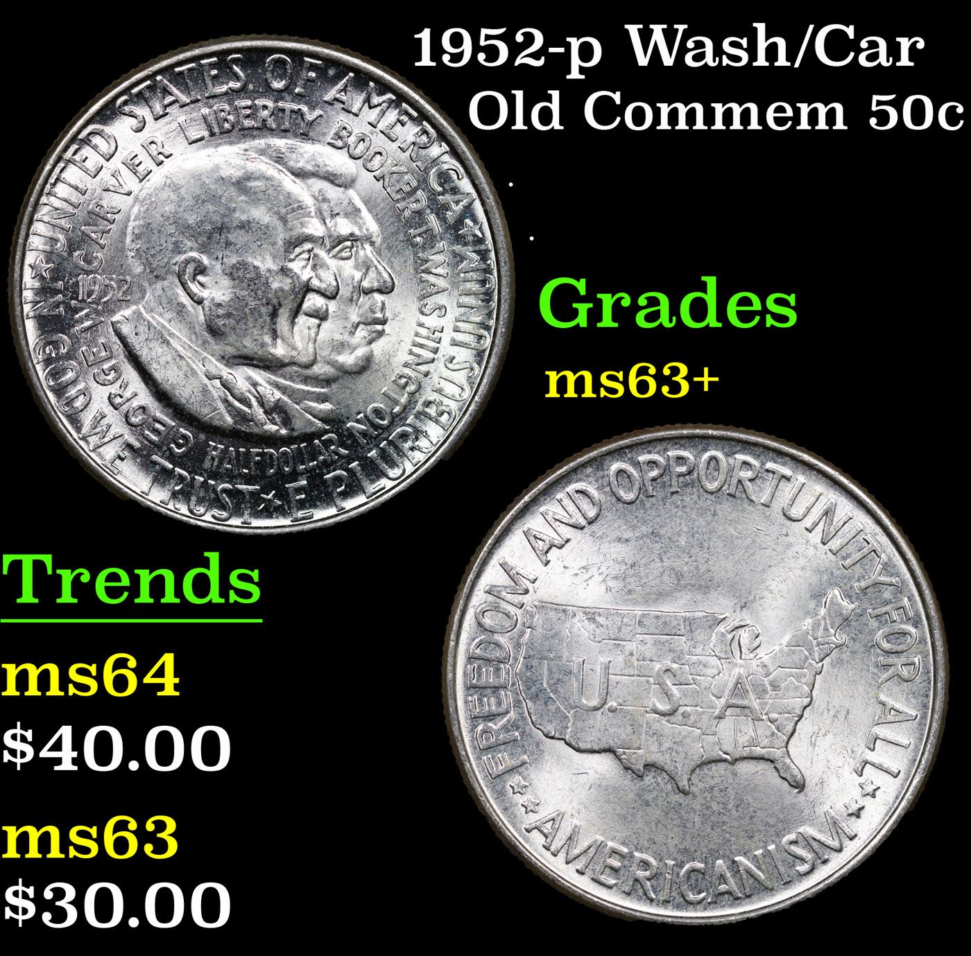1952-p Wash/Car Old Commem Half Dollar 50c Grades Select+ Unc. The Final Coin in the Old Commemorative Program. It was Minted to Revive the Ending Booker T Washington Commemorative and to Honor Washington Carver. When examining a Wash/Carver examine the High Points, which are Carver's cheek on the Obverse and the Center of the USA on the Reverse.