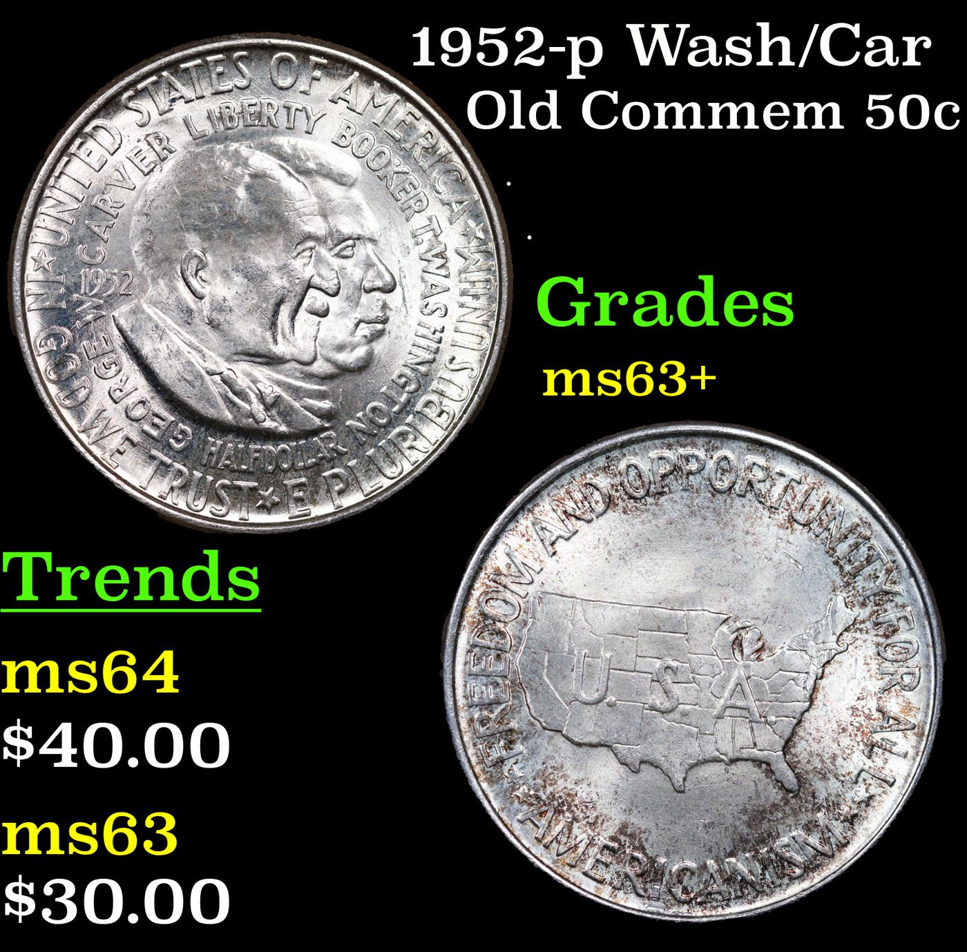 1952-p Wash/Car Old Commem Half Dollar 50c Grades Select+ Unc. The Final Coin in the Old Commemorative Program. It was Minted to Revive the Ending Booker T Washington Commemorative and to Honor Washington Carver. When examining a Wash/Carver examine the High Points, which are Carver's cheek on the Obverse and the Center of the USA on the Reverse.