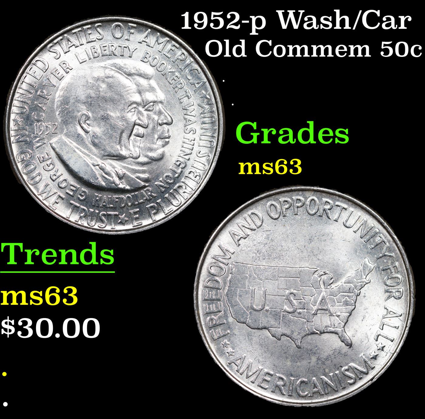 1952-p Wash/Car Old Commem Half Dollar 50c Grades Select Unc. The Final Coin in the Old Commemorative Program. It was Minted to Revive the Ending Booker T Washington Commemorative and to Honor Washington Carver. When examining a Wash/Carver examine the High Points, which are Carver's cheek on the Obverse and the Center of the USA on the Reverse.