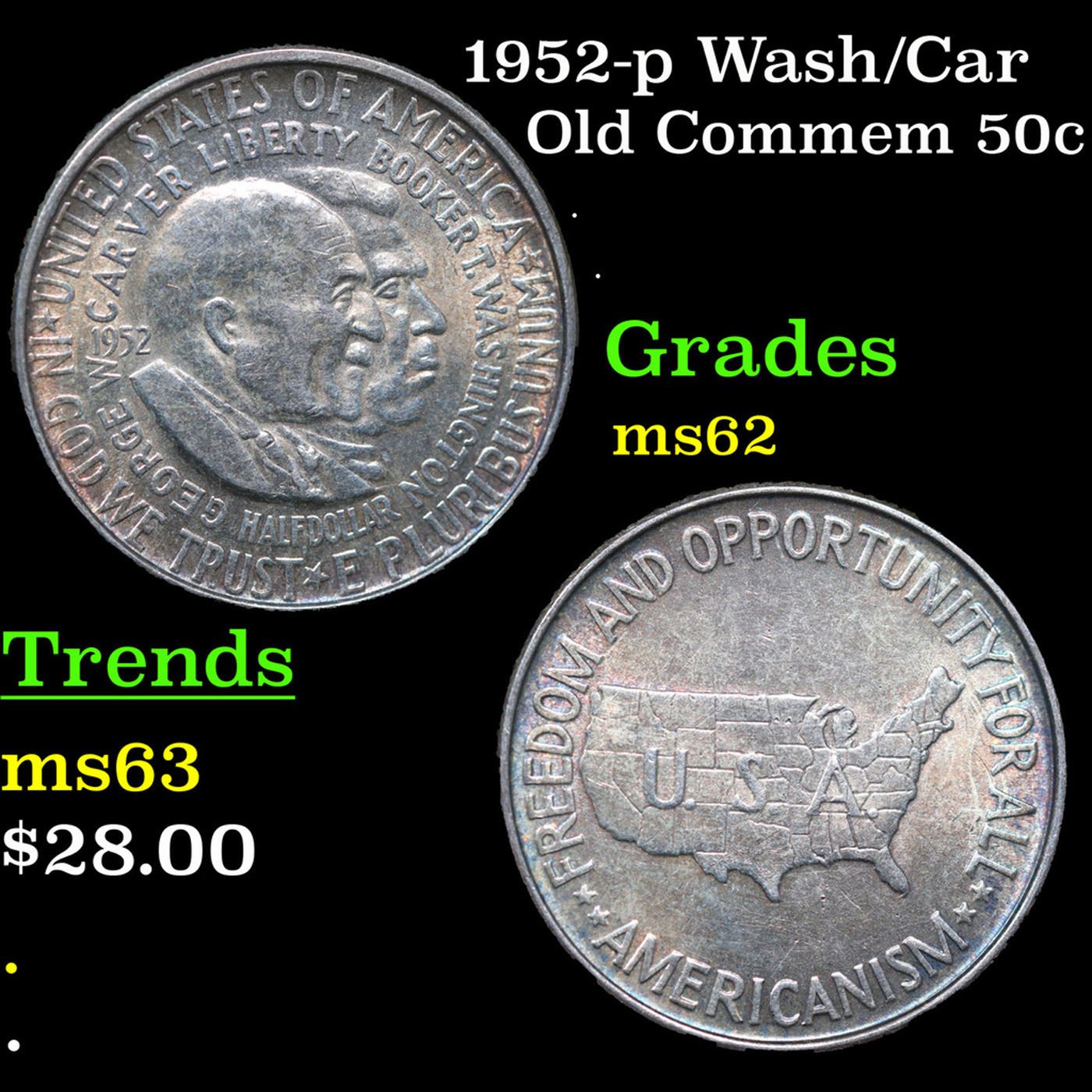 1952-p Wash/Car Old Commem Half Dollar 50c Grades Select Unc. The Final Coin in the Old Commemorative Program. It was Minted to Revive the Ending Booker T Washington Commemorative and to Honor Washington Carver. When examining a Wash/Carver examine the High Points, which are Carver's cheek on the Obverse and the Center of the USA on the Reverse.