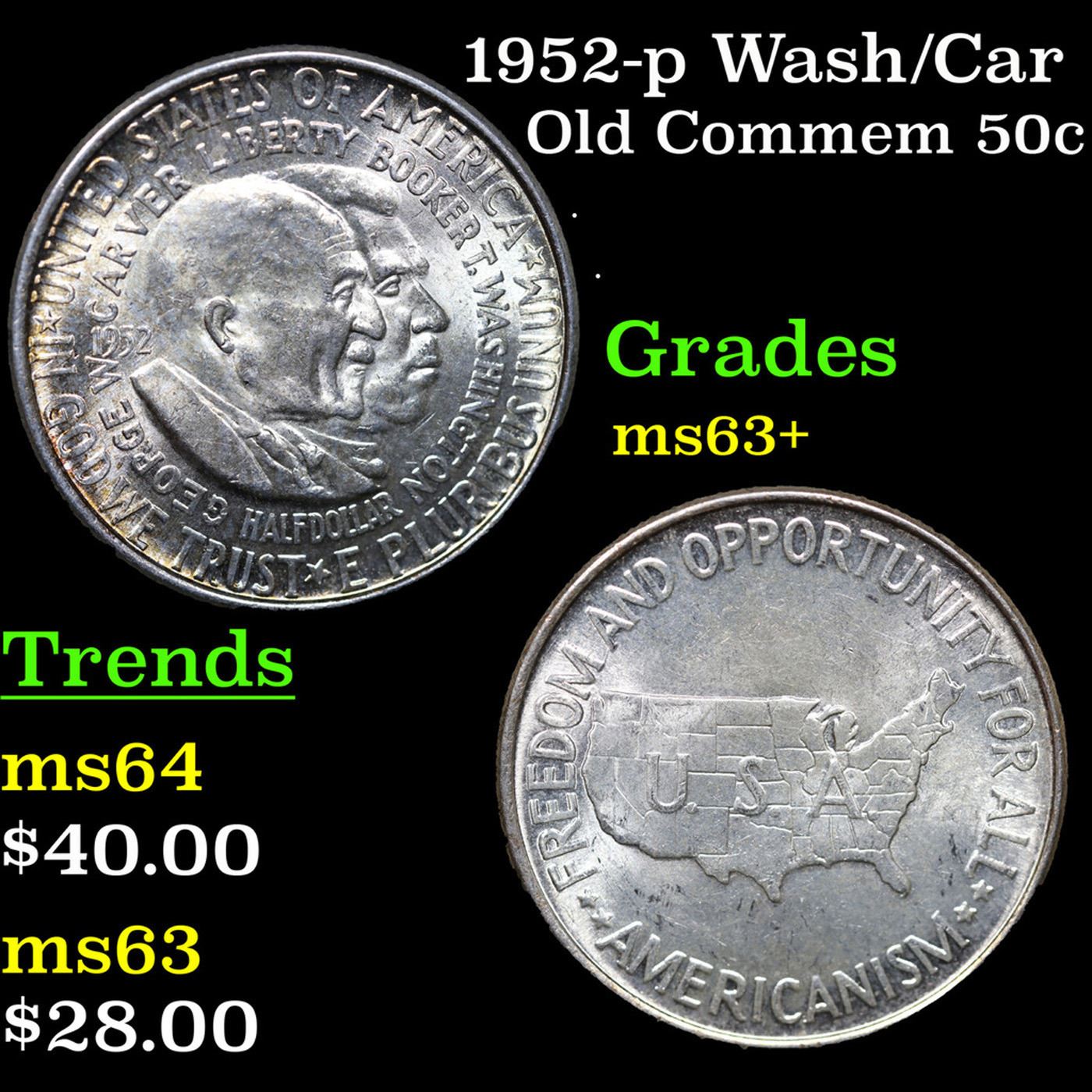 1952-p Wash/Car Old Commem Half Dollar 50c Grades Select+ Unc. The Final Coin in the Old Commemorative Program. It was Minted to Revive the Ending Booker T Washington Commemorative and to Honor Washington Carver. When examining a Wash/Carver examine the High Points, which are Carver's cheek on the Obverse and the Center of the USA on the Reverse.